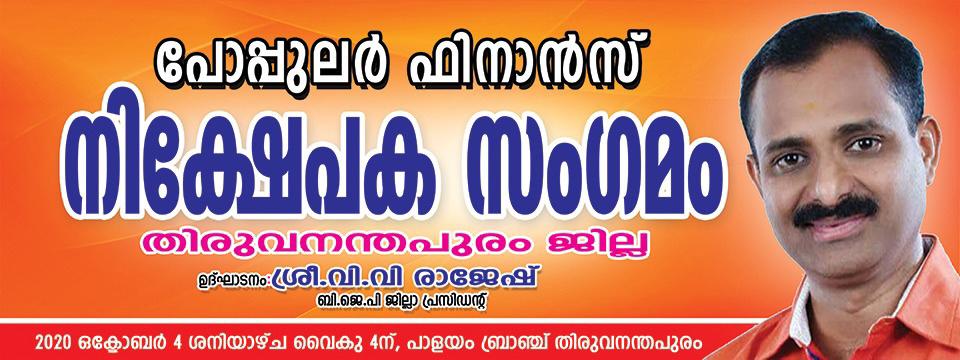 തിരുവനന്തപുരം നിക്ഷേപക സംഗമം നടത്തുന്നു . വഞ്ചിതരായ പോലീസില് പരാതി നല്കിയ ആളുകളുടെ . ചിലപ്പോള് സമരം ഭരണ സിരാകേന്ദ്രത്തില് എത്തും .ബി ജെ പി ആണ് മുന്നില് . കാരണം പോപ്പുലര് നിക്ഷേപക തട്ടിപ്പില് മറ്റ് ഒരു രാഷ്ട്രീയ പാര്ട്ടിയും നിക്ഷേപകരുടെ ഒപ്പം ഇല്ല . ഉണ്ട് എന്നു വരുത്തി തീര്ക്കാന് ഇരു പക്ഷവും ഓരോ യോഗം വിളിച്ചു . വാലാട്ടിക്കൊണ്ടു നിക്ഷേപകര് വന്നു .പിന്നെ അവരുടെ അനക്കം ഇല്ല . അവിടെ ബി ജെ പി മുന്നില് നിന്നു .