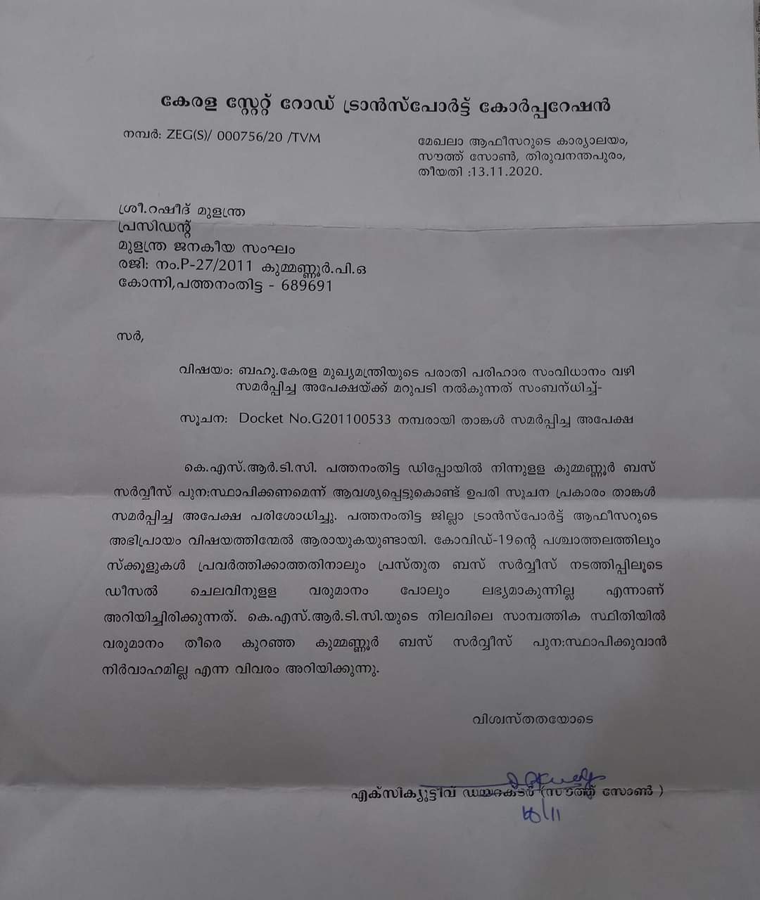 ബസ്സ് സര്വീസ് പുന:രാരംഭിക്കണം എന്നാവശ്യം ഉന്നയിച്ച് മുളന്തറ ജനകീയ സംഘം പ്രസിഡന്റും നിലവില് അതുംബുകുളം ബ്ലോക്ക് ഡിവിഷന് എല് ഡി എഫ് സ്ഥാനാര്ഥിയുമായ റഷീദ് മുളന്തറ കെ എസ്സ് ആര് ടി സിയ്ക്കു നല്കിയ നിവേദനത്തെ തുടര്ന്നു കെ എസ് ആര് ടി സി സൌത്ത് സോണ് എക്സിക്യൂട്ടീവ് ഡയറക്ടര്ആണ് ഇങ്ങനെ മറുപടി നല്കിയത് .