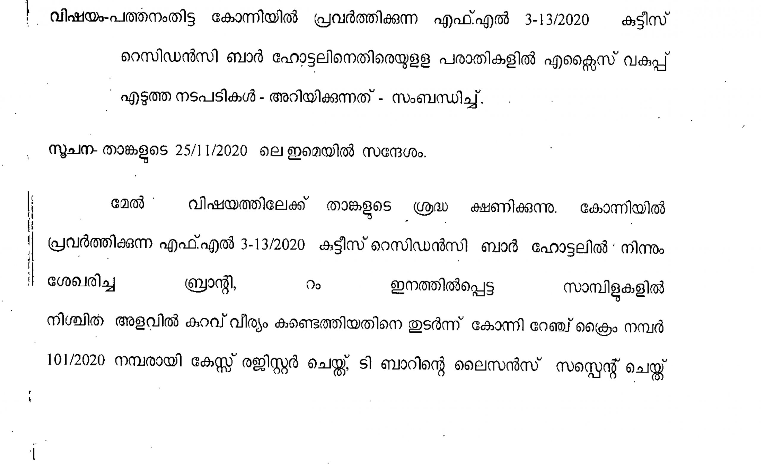 ബ്രാണ്ടി ,റം ഇനത്തില്പ്പെട്ട മദ്യത്തില് നിന്നും എടുത്ത സാമ്പിളുകളില് നിശ്ചിത അളവില് കുറവ് വീര്യം കണ്ടെത്തിയിരുന്നു . ഇതിനെ തുടര്ന്നു കോന്നി എക്സൈസ് റയിഞ്ച് ക്രൈം 101/2020 നമ്പരായി കേസ്സ് രജിസ്റ്റര് ചെയ്തു കൊണ്ട് ബാറിന്റെ എല് എല് 3-3/2020 നമ്പര് ലൈസന്സ്സ് സസ്പെന്റ് ചെയ്തു . ബാര് ലൈസന്സിയെ അറസ്റ്റ് ചെയ്യണം എന്ന് ഉപഭോക്താക്കള് ആവശ്യം ഉന്നയിച്ചു . ഉപഭോക്താക്കളെ വഞ്ചിച്ച ബാറിന്റെ ലൈസന്സ്സ് പൂര്ണ്ണമായും റദ്ദാക്കണം എന്നാണ് ആവശ്യം . വലിയ തട്ടിപ്പ് ആണ് നടന്നത് . ഇതിനെ സംബന്ധിച്ചു ഉന്നതതല അന്വേഷണം നടത്തിയാല് ചില എക്സൈസ് ജീവനക്കാരുടെ പങ്കും വെളിച്ചത്ത് വരും .
