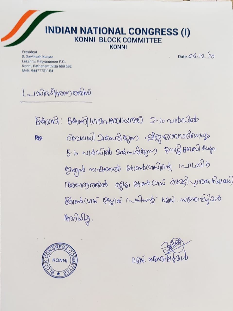 കോന്നി വാര്‍ത്ത : കോന്നി പഞ്ചായത്തില്‍ രണ്ടാം വാര്‍ഡില്‍ കോണ്‍ഗ്രസ്സ് ഔദ്യോധിക സ്ഥാനാര്‍ഥിക്കു എതിരെ മല്‍സരിക്കുന്ന റിബല്‍ സ്ഥാനാര്‍ഥികളെ കോണ്‍ഗ്രസ്സില്‍ നിന്നും പുറത്താക്കി .