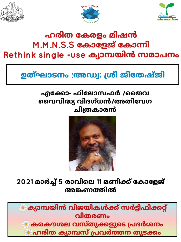 സംസ്ഥാനസർക്കാരിന്റെ ഹരിതകേരളം മിഷൻ സംഘടിപ്പിക്കുന്ന ഹരിത ക്യംപസ് പ്രവർത്തനങ്ങളുടെ ഉദ്ഘാടനം എക്കോ – ഫിലോസഫറും വിഖ്യാത രേഖാ ചിത്രകാരനുമായ അഡ്വ ജിതേഷ്ജി
