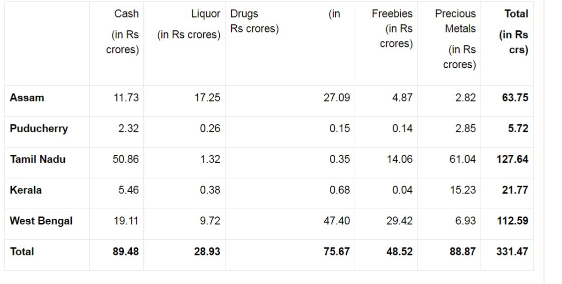 കോന്നി വാര്‍ത്ത : നിയമസഭാ തെരഞ്ഞെടുപ്പ് നടക്കാനിരിക്കുന്ന കേരളം, അസം, പശ്ചിമ ബംഗാൾ, തമിഴ്‌നാട്, കേന്ദ്രഭരണ പ്രദേശമായ പുതുച്ചേരി എന്നിവിടങ്ങളിൽ ചെലവ് നിരീക്ഷണ പ്രക്രിയയിലൂടെ 331 കോടി രൂപയുടെ റെക്കോർഡ് തുക പിടിച്ചെടുത്തു. 2016 ലെ നിയമസഭാ തെരഞ്ഞെടുപ്പുകളിൽ ഈ സംസ്ഥാന/കേന്ദ്രഭരണ പ്രദേശങ്ങളിൽ നിന്നും മൊത്തം 225.77 കോടി രൂപയാണ് പിടിച്ചെടുത്തത്.
