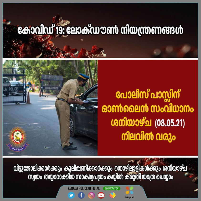 പോലീസ് പാസ്സിന് അപേക്ഷിക്കാനുള്ള ഓണ്‍ലൈന്‍ സംവിധാനം ശനിയാഴ്ച്ച വൈകുന്നേരത്തോടെ നിലവില്‍ വരും. അതിനുശേഷം മേല്‍പ്പറഞ്ഞ വിഭാഗത്തില്‍പ്പെട്ടവര്‍ നേരിട്ടോ അവരുടെ തൊഴില്‍ദാതാക്കള്‍ മുഖേനയോ പാസ്സിന് അപേക്ഷിക്കേണ്ടതാണ്. അടിയന്തിരമായി പാസ്സ് ആവശ്യമുള്ളവര്‍ക്ക് സ്റ്റേഷന്‍ ഹൗസ് ഓഫീസര്‍മാരെ നേരിട്ട് സമീപിച്ച് പാസ്സിന് അപേക്ഷ നല്‍കാവുന്നതാണ്. ഇരുവശത്തേയ്ക്കും യാത്ര ചെയ്യുന്നതിനുള്ള പാസ്സ് യാത്ര തുടങ്ങുന്ന സ്ഥലത്തുള്ള സ്റ്റേഷന്‍ ഹൗസ് ഓഫീസര്‍ തന്നെ നല്‍കും.