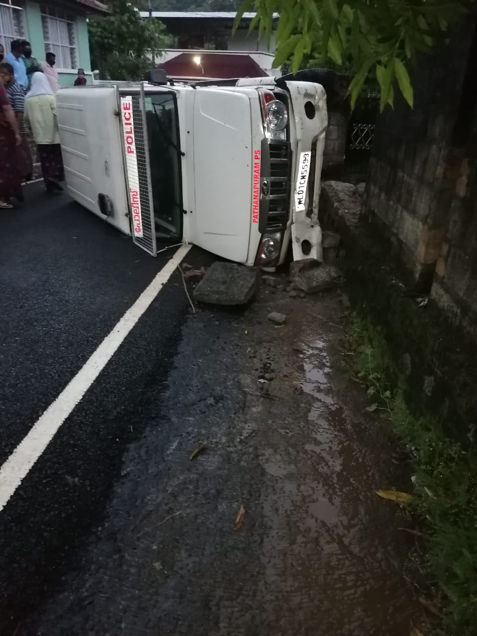 കോവിഡ് മൂലം അടച്ചിട്ട ഇടത്തറ ഭാഗത്ത് സുരക്ഷാ കാര്യങ്ങള്ക്ക് വേണ്ടിയാണ് പോലീസ് എത്തിയത് . എതിരെ വന്ന ബൈക്കുകാരന് നിര്ത്താതെ പോയി . സമീപ വീടിന്റെ മതില് ഇടിച്ചാണ് പോലീസ് വാഹനം മറിഞ്ഞത്