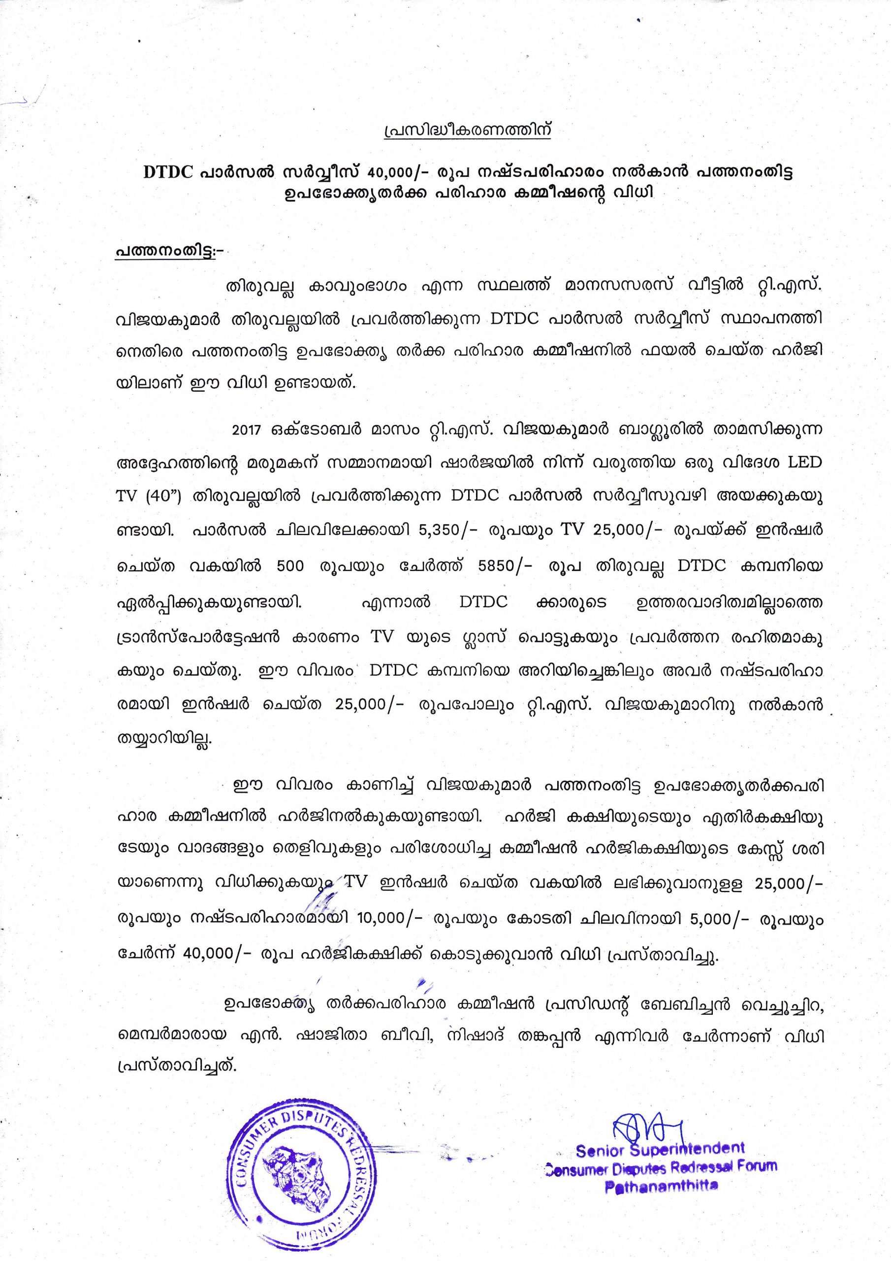 ഡിടിഡിസി പാഴ്‌സല്‍ സര്‍വീസ് 40,000 രൂപ നഷ്ടപരിഹാരം നല്‍കണം: പത്തനംതിട്ട ഉപഭോകൃത കോടതി