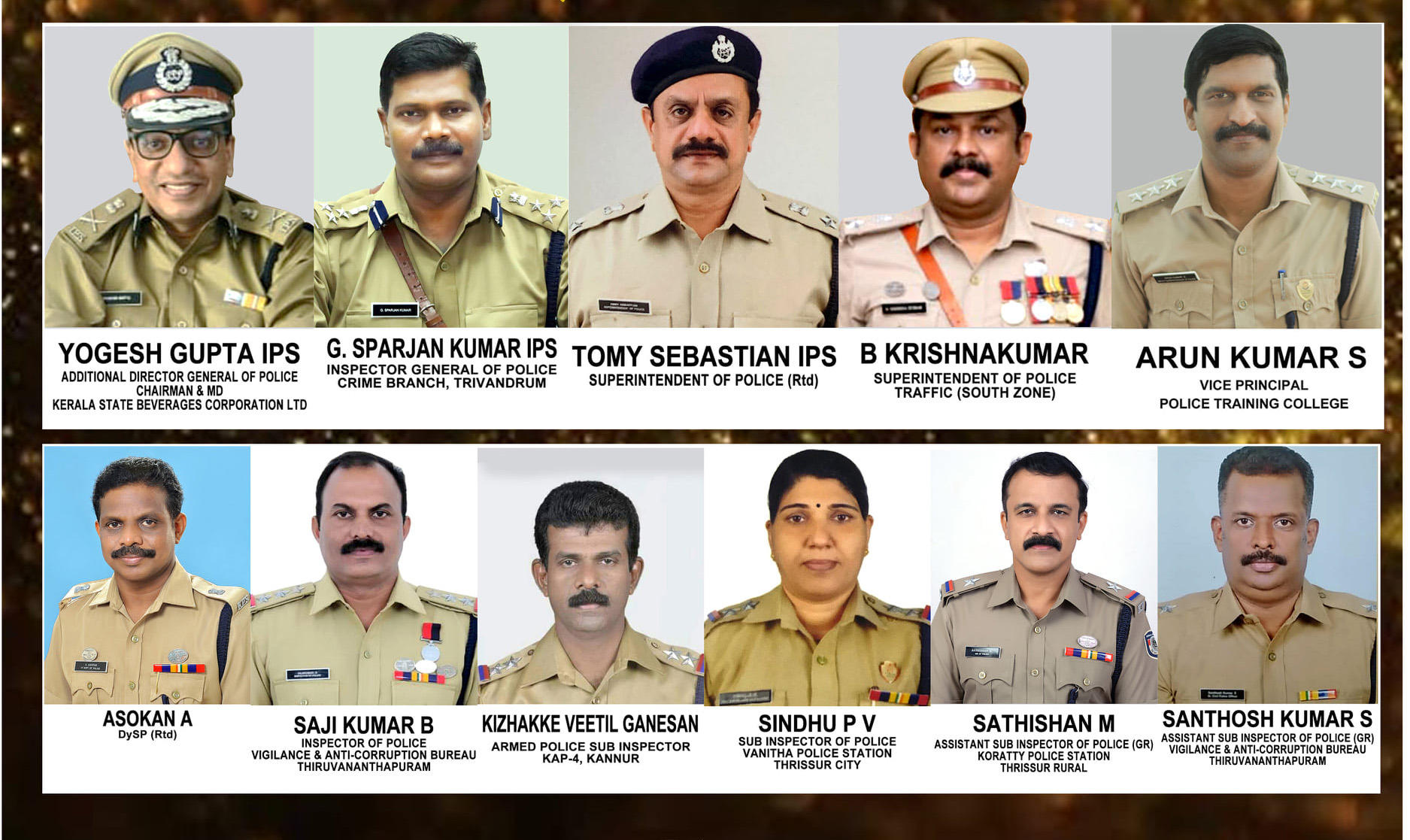 നിലവില്‍ തൃശ്ശൂര്‍ സിറ്റി വനിതാ പോലീസ് സ്റ്റേഷന്‍ സബ് ഇന്‍സ്പെക്ടറാണ് സിന്ധു.പി.വി. 2017 ല്‍ മുഖ്യമന്ത്രിയുടെ പോലീസ് മെഡല്‍ ലഭിച്ചിരുന്നു. അസിസ്റ്റന്‍റ് സബ് ഇന്‍സ്പെക്ടറായ സന്തോഷ് കുമാര്‍.എസ് നിലവില്‍ വിജിലന്‍സ് തിരുവനന്തപുരം മരുതംകുഴി യൂണിറ്റില്‍ ജോലിനോക്കിവരികയാണ്. 2009ല്‍ മുഖ്യമന്ത്രിയുടെ പോലീസ് മെഡല്‍ ലഭിച്ചിരുന്നു. അസിസ്റ്റന്‍റ് സബ് ഇന്‍സ്പെക്ടറായ സതീശന്‍.എം തൃശ്ശൂര്‍ റൂറലിലെ കൊരട്ടി പെലീസ് സ്റ്റേഷനില്‍ ആണ്. 2013ല്‍ മുഖ്യമന്ത്രിയുടെ പോലീസ് മെഡല്‍ ലഭിച്ചിരുന്നു.