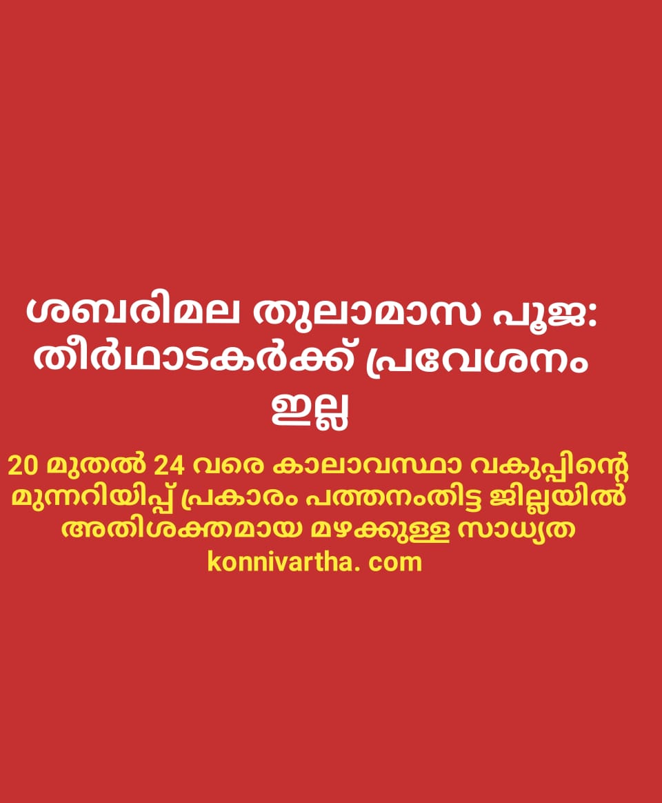 കോന്നി വാര്ത്ത ഡോട്ട് കോം : ശക്തമായ മഴയുടെ സാഹചര്യത്തില് ശബരിമല തുലാമാസ പൂജയ്ക്ക് തീര്ഥാടകര്ക്ക് പ്രവേശനം ഉണ്ടായിരിക്കുന്നതല്ല. ജില്ലയില് പ്രതികൂല കാലാവസ്ഥ തുടരുകയാണ്. ഈ മാസം 20 മുതല് 24 വരെ കാലാവസ്ഥാ വകുപ്പിന്റെ മുന്നറിയിപ്പ് പ്രകാരം ജില്ലയില് അതിശക്തമായ മഴക്കുള്ള സാധ്യത നിലനില്ക്കുന്നുണ്ട്.