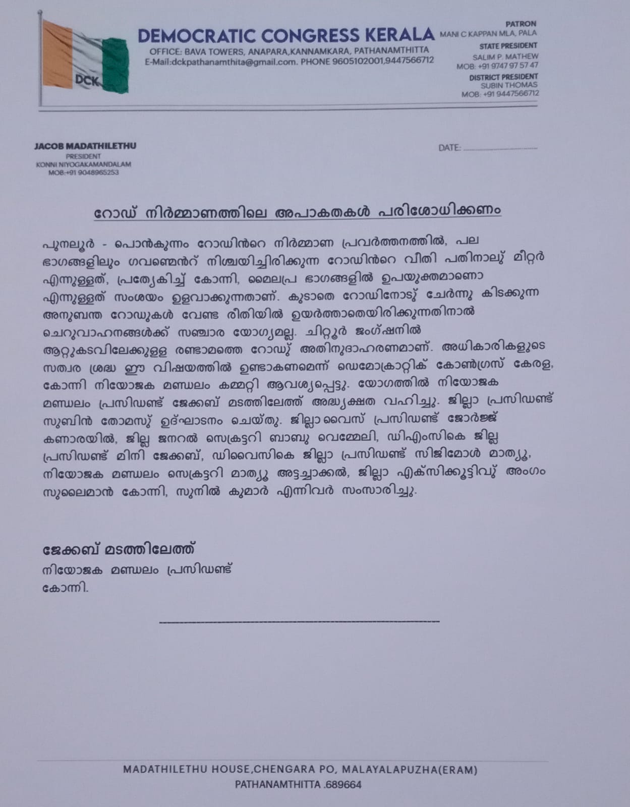 യോഗത്തിൽ നിയോജക മണ്ഡലം പ്രസിഡണ്ട് ജേക്കബ് മടത്തിലേത്ത് അദ്ധ്യക്ഷത വഹിച്ചു. ജില്ലാ പ്രസിഡണ്ട് സുബിൻ തോമസ് ഉദ്ഘാടനം ചെയ്തു. ജില്ലാ വൈസ് പ്രസിഡണ്ട് ജോർജ്ജ് കണാരയിൽ, ജില്ല ജനറൽ സെക്രട്ടറി ബാബു വെമ്മേലി, ഡിഎംസികെ ജില്ല പ്രസിഡണ്ട് മിനി ജേക്കബ്, ഡിവൈസികെ ജില്ലാ പ്രസിഡണ്ട് സിജിമോൾ മാത്യൂ, നിയോജക മണ്ഡലം സെക്രട്ടറി മാത്യൂ മനത്രയിൽ, ജില്ലാ എക്സിക്കൂട്ടിവു് അംഗം സുലൈമാൻ കോന്നി, സുനിൽ കുമാർ എന്നിവർ സംസാരിച്ചു.