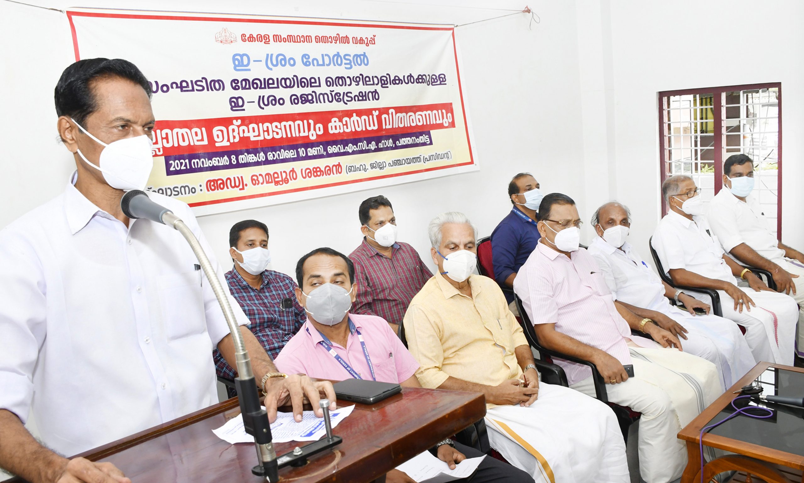 ജില്ലയില് അസംഘടിത മേഖലയില് ജോലി ചെയ്യുന്ന തൊഴിലാളികള്ക്കുള്ള ഏകീകൃത തിരിച്ചറിയല് കാര്ഡിന്റെ ജില്ലാതല രജിസ്ട്രേഷനും കാര്ഡ് വിതരണവും പത്തനംതിട്ട വൈ.എം.സി.എ ഹാളില് ജില്ലാ പഞ്ചായത്ത് പ്രസിഡന്റ് അഡ്വ: ഓമല്ലൂര് ശങ്കരന് നിര്വഹിച്ചു.