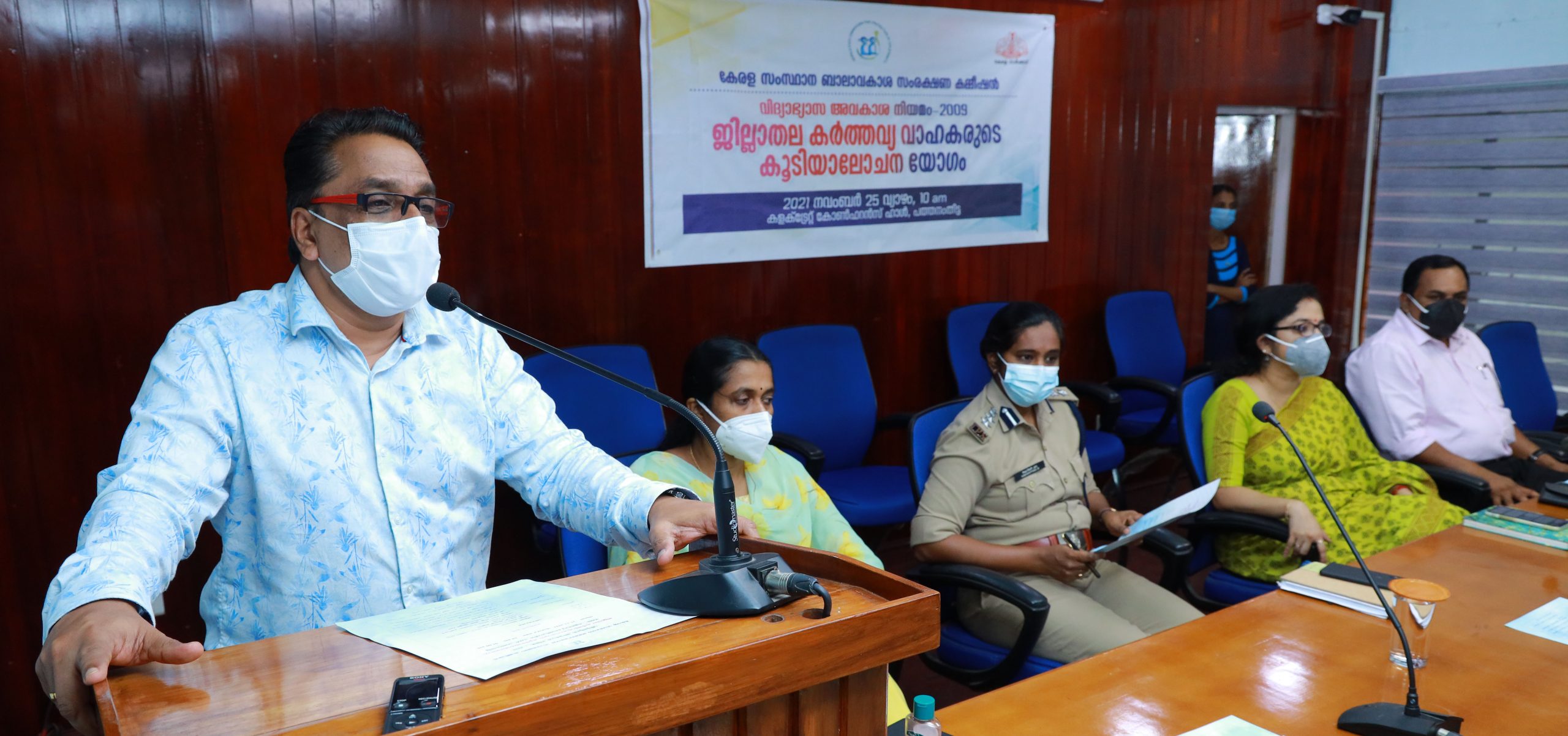 കുട്ടികളുടെ ഏറ്റവും പ്രധാനപ്പെട്ട അവകാശങ്ങളില്‍ ഒന്നാണ് വിദ്യാഭ്യാസ അവകാശ നിയമം. കുട്ടികളുടെ വികസനത്തിന് ആവശ്യമായ സംരക്ഷണവും സുരക്ഷിതത്വവും അതിജീവനവും പങ്കാളിത്തവുമെല്ലാം വിദ്യാഭ്യാസ മേഖലയില്‍ നിന്നും പൊതുസമൂഹത്തില്‍ നിന്നും ഉണ്ടാകേണ്ടതുണ്ട്. വിദ്യാഭ്യാസം ലഭിക്കുന്ന കുട്ടിക്ക് സുരക്ഷ, സംരക്ഷണം, പങ്കാളിത്തം, അതിജീവനത്തിനാവശ്യമായ സൗകര്യം എന്നിവ ലഭ്യമായാല്‍ മാത്രമേ വിദ്യാഭ്യാസത്തിന്റെ പൂര്‍ണതയിലേക്ക് എത്താന്‍ കഴിയുള്ളൂ. കുട്ടികളുടെ വളര്‍ച്ചയ്ക്ക് ആവശ്യമായ ഒട്ടനവധി പദ്ധതികളാണ് വിവിധ വകുപ്പുകള്‍ നടത്തിവരുന്നത്. പോലീസ്, എക്‌സൈസ്, സാമൂഹ്യ നീതി, എസ്‌സി. എസ്ടി, വനിതാ ശിശു വികസന വകുപ്പ് തുടങ്ങി നിരവധി വകുപ്പുകളാണ് ഇത്തരത്തില്‍ പ്രവര്‍ത്തിച്ചു വരുന്നത്. ജില്ലാ ഭരണകേന്ദ്രവും വിവിധ പദ്ധതികള്‍ ആവിഷ്‌കരിച്ചു വരുന്നു. ഇത്തരത്തില്‍ ലഭിക്കുന്ന പദ്ധതികളുടെ ക്രോഡീകരണം പരിശോധനയ്ക്ക് വിധേയമാക്കണം.