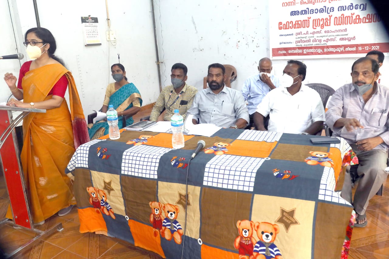 സമൂഹത്തിലെ ആശ്രയമില്ലാത്തവരും, ഇതുവരെ ഒരു ദാരിദ്ര്യ നിര്മാര്ജന പരിപാടികളില് ഉള്പ്പെട്ടില്ലാത്തവരുമായ അതിദരിദ്ര്യരെ കണ്ടെത്തി പട്ടികയില് ഉള്പ്പെടുത്തുന്നതിനുള്ള വാര്ഡുതല ജനകീയ പ്രവര്ത്തനങ്ങള്ക്ക് പെരുനാട് പഞ്ചായത്തില് തുടക്കമായി. മഠത്തുംമൂഴി ശബരിമല ഇടത്താവളത്തില് വിവിധ വാര്ഡുതല ഫോക്കസ്ഗ്രൂപ്പ് ചര്ച്ചകള് ജില്ലാകളക്ടര് ഡോ.ദിവ്യഎസ്അയ്യര് ഉദ്ഘാടനം ചെയ്തു.