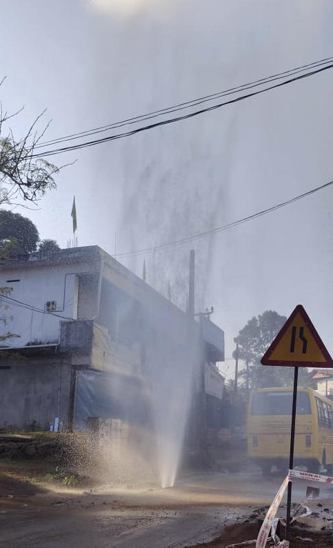 റോഡു പണികള്ക്ക് വേണ്ടി തകൃതിയായി കുത്തി പൊട്ടിക്കല് നടക്കുമ്പോള് പൈപ്പ് പൊട്ടി മല പോലെ വെള്ളം ഉയര്ന്നു വരുന്നത് ജനങ്ങളില് കൌതുകം ഉണര്ത്തി . വാഹനങ്ങളില് പറ്റി പിടിച്ച പൊടി എന്തായാലും കഴുകി കളയാന് അധികാരികള് അവസരം ഒരുക്കിയതിനു നന്ദി . മണിക്കൂറുകള് ഈ വെള്ളം ഇങ്ങനെ ഒഴുകി .