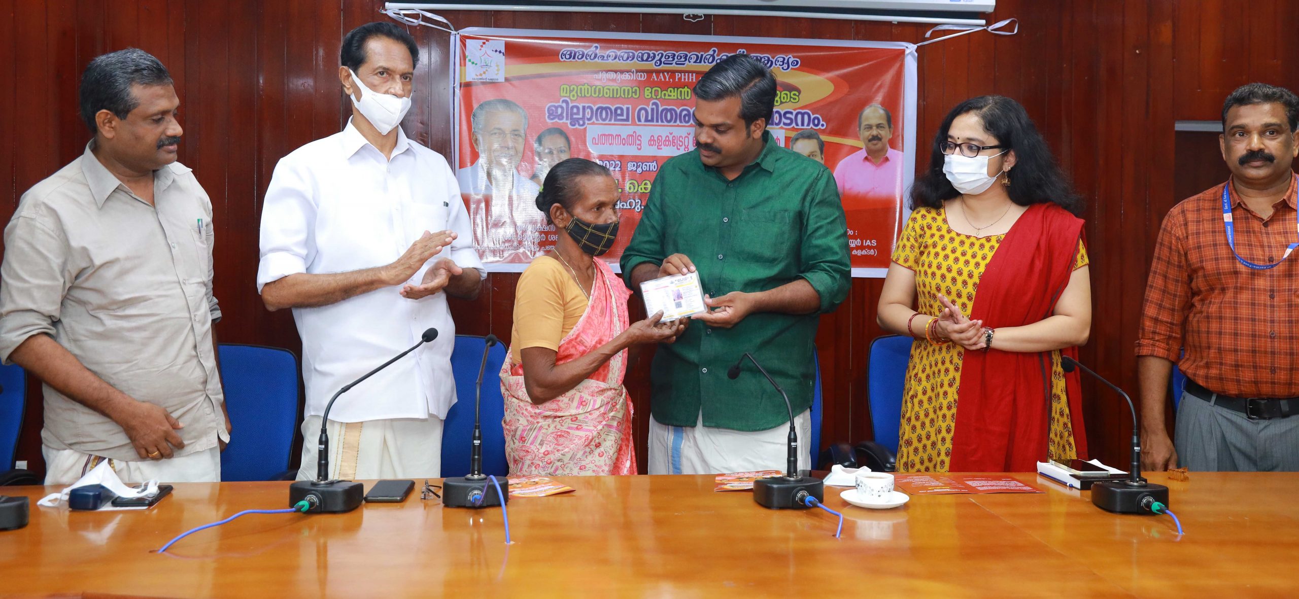 സംസ്ഥാന സര്ക്കാരിന്റെ ഒന്നാം വാര്ഷികാഘോഷത്തിന്റെ ഭാഗമായി നൂറുദിന കര്മ്മ പരിപാടിയില് ഉള്പ്പെടുത്തിയാണ് അര്ഹരായ മുന്ഗണനാ വിഭാഗക്കാര്ക്കും എഎവൈ(മഞ്ഞ), പിഎച്ച്എച്ച്( പിങ്ക്) റേഷന് കാര്ഡ് ഉടമകള്ക്കും കാര്ഡുകള് വിതരണം ചെയ്യുന്നത്. 120 പിങ്ക് കാര്ഡുകളും, 12 മഞ്ഞ കാര്ഡുകളുമാണ് ചടങ്ങില് വിതരണം ചെയ്തത്. പൊതുവിതരണ സംവിധാനം ഏറ്റവും കൃത്യമായി നടക്കുന്ന സംസ്ഥാനമാണ് കേരളമെന്ന് അധ്യക്ഷത വഹിച്ച് സംസാരിച്ച ജില്ലാ പഞ്ചായത്ത് പ്രസിഡന്റ് അഡ്വ.ഓമല്ലൂര് ശങ്കരന് പറഞ്ഞു. പൊതുവിതരണ രംഗം സുതാര്യമായാണ് പ്രവര്ത്തിക്കുന്നത്. ജില്ലയിലെ മികച്ച അഞ്ചുറേഷന് കടകള് കെ- സ്റ്റോറുകളാക്കുമെന്നും ജില്ലാ പഞ്ചായത്ത് പ്രസിഡന്റ് പറഞ്ഞു.