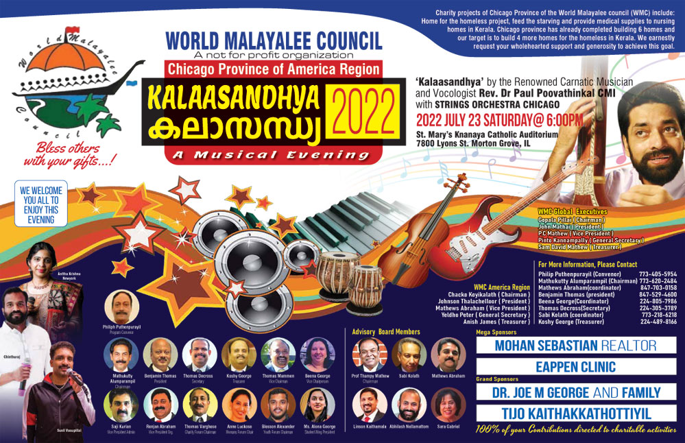 konnivartha.com : വേള്ഡ് മലയാളി കൗണ്സില് ചിക്കാഗോ പ്രോവിന്സിന്റെ ആഭ്യമുഖ്യത്തില് ജൂലൈ 23 ന് ശനിയാഴ്ച വൈകുന്നേരം മോര്ട്ടന്ഗ്രോവില് വച്ചു നടത്തുന്ന ”കലാസന്ധ്യ-2022” സംഗീതസായാഹ്നത്തിന്റ അവസാനഘട്ട ഒരുക്കങ്ങള് പൂര്ത്തിയായതായി ഡബ്ല്യൂ.എം.സി പ്രോവിന്സ് ഭാരവാഹികള് അറിയിച്ചു.