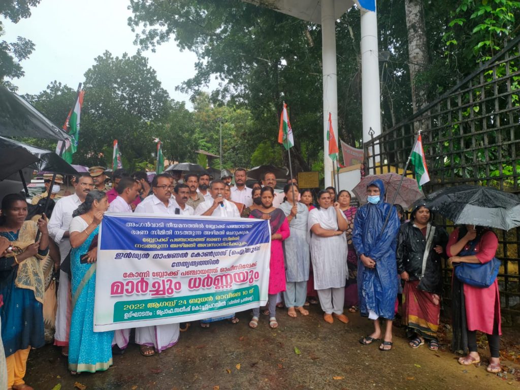 konnivartha.com : കോന്നി ബ്ലോക്ക് പഞ്ചായത്ത് ഭരണസമിതിയുടെ അഴിമതികൾ അന്വേഷണ വിധേയമാക്കണമെന്ന് ആവശ്യപ്പെട്ടുകൊണ്ടും, പ്രതിപക്ഷത്തെ അംഗീകരിക്കാതെ തീരുമാനങ്ങൾ കൈകൊള്ളുന്ന പ്രസിഡൻ്റിൻ്റെ നിലപാടുകൾ മാറ്റണമെന്നാവശ്യപ്പെട്ടുകൊണ്ടും ഇൻഡ്യൻ നാഷണൽ കോൺഗ്രസ്സിൻ്റെ ജനപ്രതിനിധികളുടെ നേതൃത്വത്തിൽ കോന്നി ബ്ലോക്ക് പഞ്ചായത്ത് ഓഫീസിലേക്ക് മാർച്ചും ധർണ്ണയും നടത്തി.