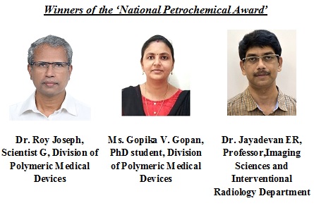 കേന്ദ്ര രാസവസ്തു വളം മന്ത്രാലയത്തിന് കീഴിലുള്ള കെമിക്കൽസ് ആൻഡ് പെട്രോകെമിക്കൽസ് വകുപ്പ് ഏർപ്പെടുത്തിയ, ‘പോളിമേഴ്സ് ഇൻ മെഡിക്കൽ ആൻഡ് ഫാർമസ്യൂട്ടിക്കൽ ആപ്ലിക്കേഷനുകൾ’ വിഭാഗത്തിന് കീഴിലുള്ള പതിനൊന്നാമത് ‘ദേശീയ പെട്രോകെമിക്കൽസ് അവാർഡ് ഈ കണ്ടുപിടിത്തത്തിന് ലഭിച്ചു’