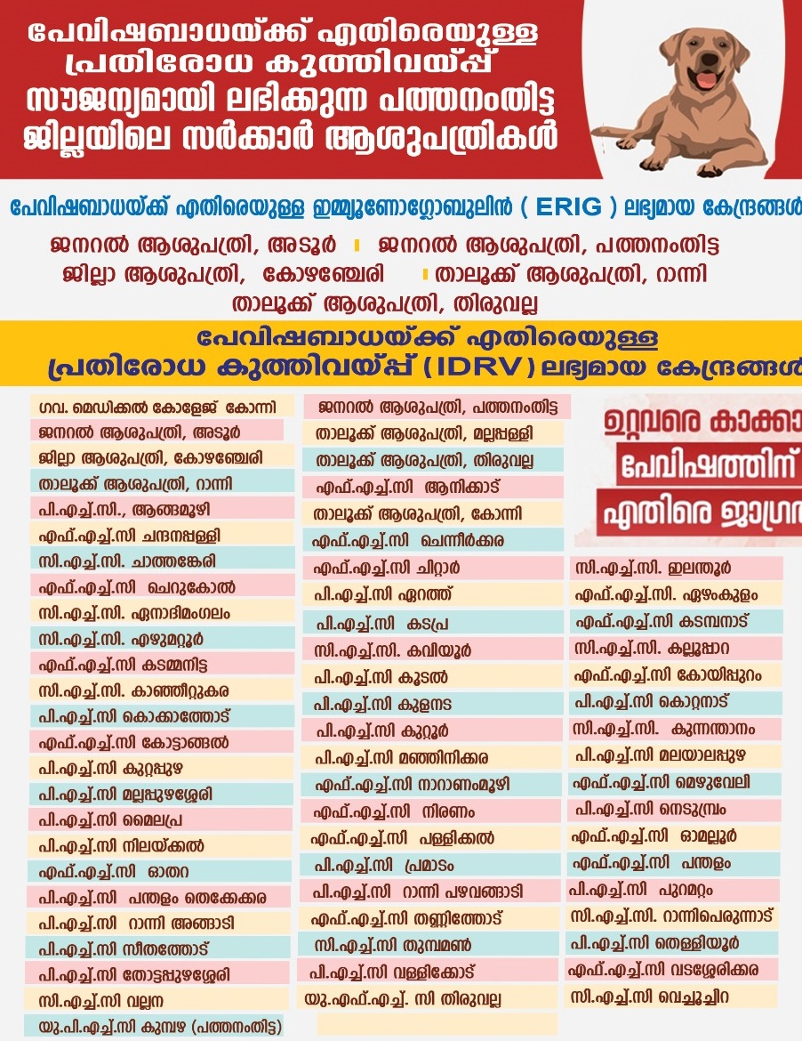 അടിയന്തിര രോഗപ്രതിരോധ ശേഷി ലഭിക്കുന്നതിനായി മുറിവിനു ചുറ്റും കുത്തി വയ്ക്കുന്ന ആന്റിറാബീസ് ഇമ്മ്യൂണോഗ്ലോബുലിന് പത്തനംതിട്ട ജനറല് ആശുപത്രി, അടൂര് ജനറല് ആശുപത്രി, കോഴഞ്ചേരി ജില്ലാ ആശുപത്രി, തിരുവല്ല താലൂക്ക് ആസ്ഥാന ആശുപത്രി, റാന്നി താലൂക്ക് ആസ്ഥാന ആശുപത്രി എന്നിവിടങ്ങളില് നിന്നും സൗജന്യമായി ലഭ്യമാണ്.