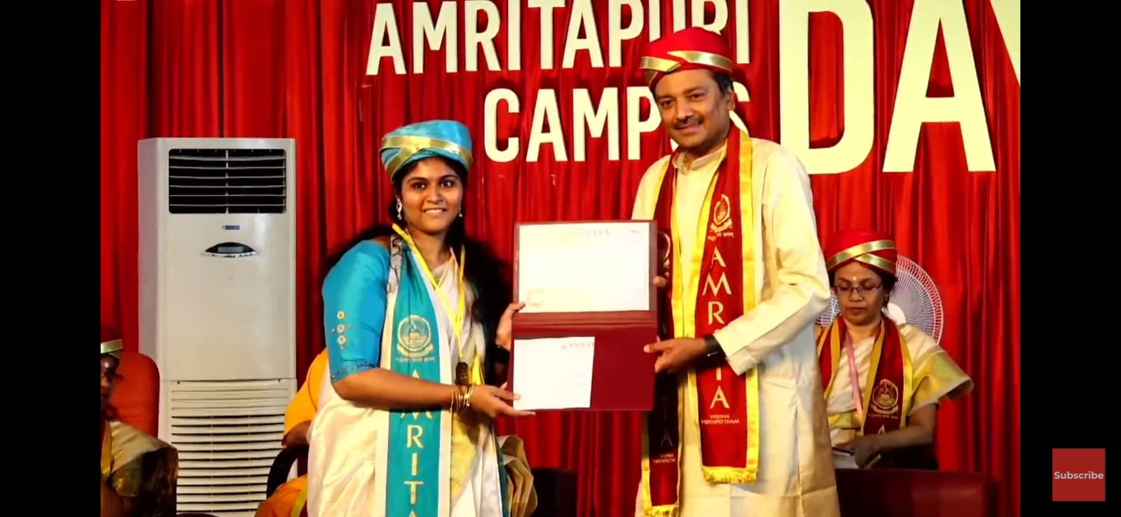 അമൃതപുരി കാമ്പസ്സില് വെച്ച് ഗോള്ഡ് മെഡല് പുരസ്ക്കാരം സമ്മാനിച്ചു . പത്തനംതിട്ട അമൃത വിദ്യാലയത്തിലെ പൂര്വ്വ വിദ്യാര്ഥിനിയാണ് ആര്യജയകുമാര് .