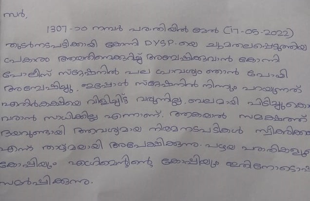 ഈ പരാതി ഒരു വര്ഷം മുന്നേ കോന്നി പോലീസിനു ലഭിച്ചു എങ്കിലും അന്വേഷണം നടന്നില്ല .രണ്ടു തവണ പരാതി ജില്ലാ പോലീസില് കിട്ടി എങ്കിലും കോന്നി പോലീസിനു വന്ന പരാതി അന്വേഷിഷിച്ചില്ല .പരാതി കൊടുത്ത വനിതയുടെ മൊഴി എടുത്തില്ല . കോന്നി പോലീസിനു എതിരെ ഗുരുതര ആരോപണം .