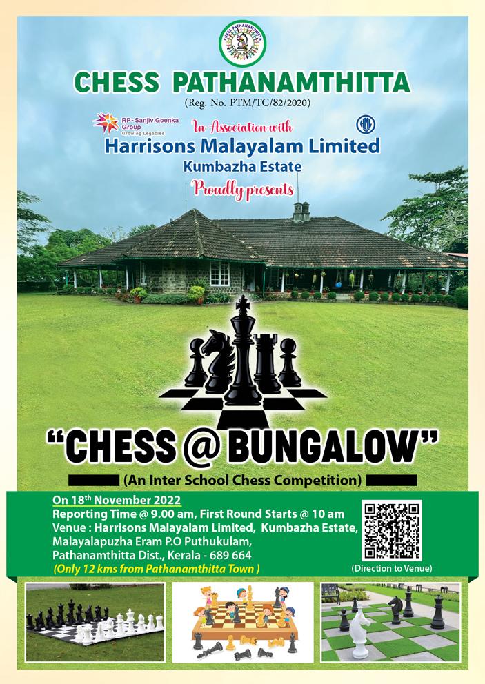 കോന്നി: ചെസ്സ് പത്തനംതിട്ട ഒന്ന് മുതൽ പ്ലസ് ടു വരെയുള്ള സ്കൂൾ വിദ്യാർഥികൾക്കായി ചെസ് അറ്റ് ബംഗ്ലാവ് എന്ന പേരിൽ ചെങ്ങറ ഹാരിസൺസ് മലയാളം പ്ളാന്റേഷൻ എസ്റ്റേറ്റ് ബംഗ്ലാവിൽ 18 ന് ചെസ്സ് ടുർണമെന്റ് സംഘടിപ്പിക്കുന്നു. എസ്റ്റേറ്റിന്റെ ഏറ്റവും ഹരിത മനോഹരവും ശാന്തവുമായ അന്തരീക്ഷത്തിൽ എസ്റ്റേറ്റ് ബംഗ്ലാവിന്റെ മുറ്റത്ത് ചെസ്സ് കളിക്കാനുള്ള അവസരമാണ് സംഘാടകർ വിദ്യാർഥികൾക്കായി ഒരുക്കുന്നത്. രജിസ്ട്രേഷൻ ഫീസ് 250 രൂപയാണ്. ഒന്നാം ക്ളാസ് മുതൽ നാലുവരെയും അഞ്ചാം ക്ളാസ് മുതൽ എട്ടു വരെയും ഒൻപതാം ക്ളാസ് മുതൽ പന്ത്രണ്ടു വരെയും മുന്ന് വിഭാഗങ്ങളായി തിരിച്ചാണ് മത്സരം നടത്തുന്നത്. വിജയികൾക്ക് ക്യാഷ് പ്രൈസും ട്രോഫിയും നൽകും. ഏറ്റവും മികച്ച പ്രകടനം കാഴചവയ്ക്കുന്ന പത്തു പേർക്ക് വിദഗ്ധ പരിശീലകരുടെ കീഴിൽ രണ്ടു ദിവസത്തെ സൗജന്യ ചെസ്സ് പരിശീലനവും നൽകും. പേരുകൾ രജിസ്റ്റർ ചെയ്യണ്ട അവസാന തീയതി 15 ആണ്. മത്സരത്തിൽ പങ്കെടുക്കുന്നവർക്ക് ഭക്ഷണവും നൽകും. ഫോൺ: 9846667997 9947119038