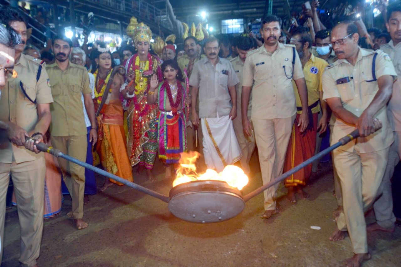 പതിനെട്ടാം പടിയ്ക്കുതാഴെ ഘോഷയാത്ര സമാപിച്ചു. പുലിപ്പുറത്തേറിയ മണികണ്ഠന്, പന്തളരാജാവ്, വെളിച്ചപ്പാട്, വാവര് സ്വാമി, പരമശിവന്, പാര്വതി, സുബ്ര്ഹ്മണ്യന്, ഗണപതി, മഹിഷി, ഗരുഡന് തുടങ്ങിയ ദേവതാവേഷങ്ങളും വാദ്യമേളങ്ങളും വര്ണക്കാവടികളും അണിനിരന്ന ഘോഷയാത്ര വൈകിട്ട്് സന്നിധാനത്തു തടിച്ചുകൂടിയ ഭക്തസഹസ്രങ്ങള്ക്ക് ഉത്സവക്കാഴ്ചയായി.