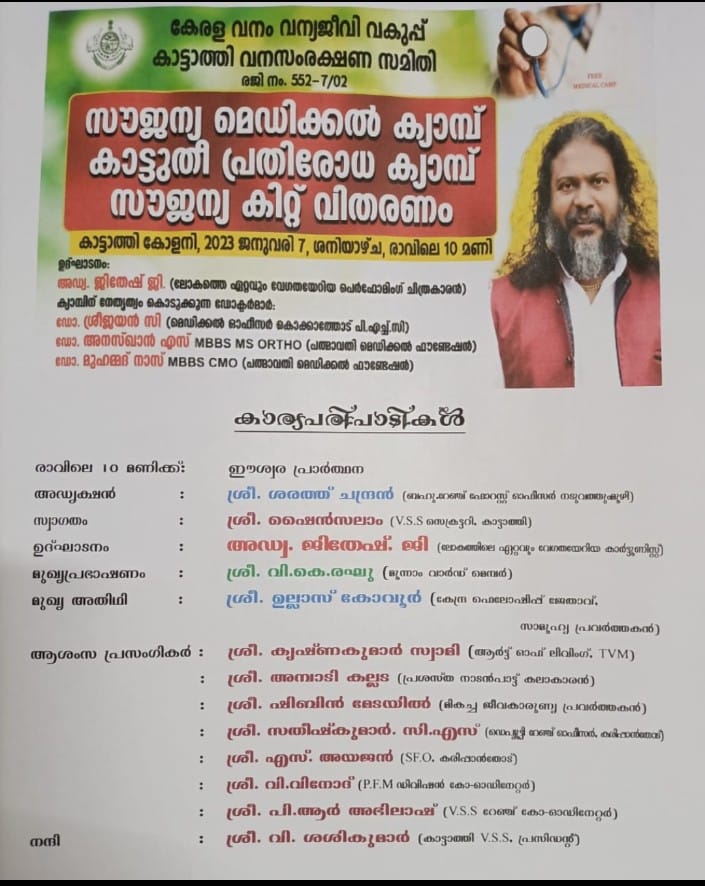 കേരള വനം വന്യജീവി വകുപ്പ്, കാട്ടാത്തി വനസംരക്ഷണസമിതി എന്നിവയുടെ സംയുക്ത ആഭിമുഖ്യത്തിൽ കോന്നി കല്ലേലി കാട്ടാത്തി കോളനിയിൽ ജനുവരി 7 ശനിയാഴ്ച രാവിലെ 10 മണിക്ക് സൗജന്യ മെഡിക്കൽ ക്യാമ്പ്, കാട്ടുതീ പ്രതിരോധ ക്യാമ്പ്, സൗജന്യ കിറ്റ് വിതരണം എന്നിവ നടക്കും.