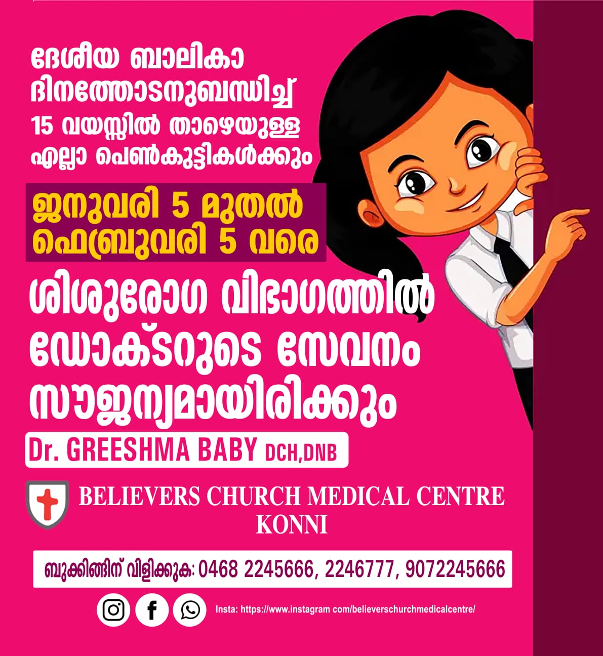 ദേശീയ ബാലികാ ദിനത്തോട് അനുബന്ധിച്ച് കോന്നി ബിലീവേഴ്സ് ചർച്ച് മെഡിക്കൽ സെന്ററിൽ ജനുവരി അഞ്ചു മുതൽ ഫെബ്രുവരി 5 വരെ 15 വയസ്സിൽ താഴെ ഉള്ള എല്ലാ പെൺകുട്ടികൾക്കും ശിശു രോഗ വിഭാഗത്തിൽ ഡോക്ടറുടെ സേവനം സൗജന്യമാണ്