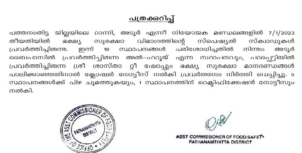 ഭക്ഷ്യ സുരക്ഷാ പരിശോധന :പത്തനംതിട്ട ജില്ലയില്‍ രണ്ടു സ്ഥാപനങ്ങളുടെ പ്രവര്‍ത്തനം നിര്‍ത്തി വെപ്പിച്ചു