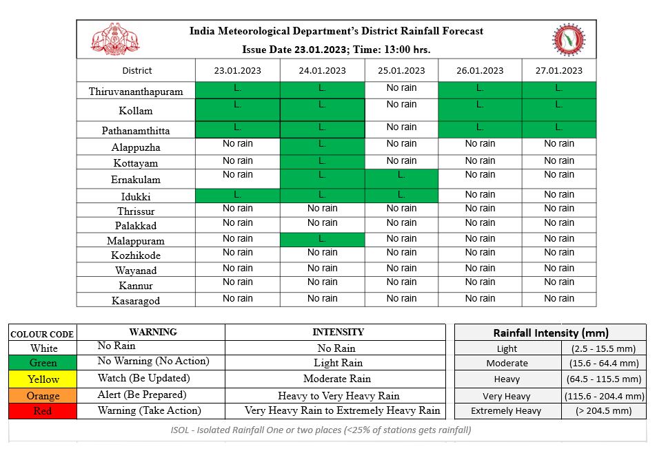 konnivartha.com :പത്തനംതിട്ട ജില്ലയടക്കമുള്ള നാല് ജില്ലകളില്‍ നേരിയ മഴയ്ക്ക് സാധ്യത . തിരുവനന്തപുരം ,കൊല്ലം ,പത്തനംതിട്ട ,ഇടുക്കി ജില്ലയിലാണ് ഇന്ന് നേരിയ മഴ സാധ്യതാ പട്ടികയില്‍ ഉള്ളത് .നാളെ ( 24/01/2023)എട്ടു ജില്ലകളില്‍ നേരിയ മഴ സാധ്യതയും ഉണ്ട് എന്ന് കാലാവസ്ഥാ നിരീക്ഷണ കേന്ദ്രം കണക്കു കൂട്ടുന്നു