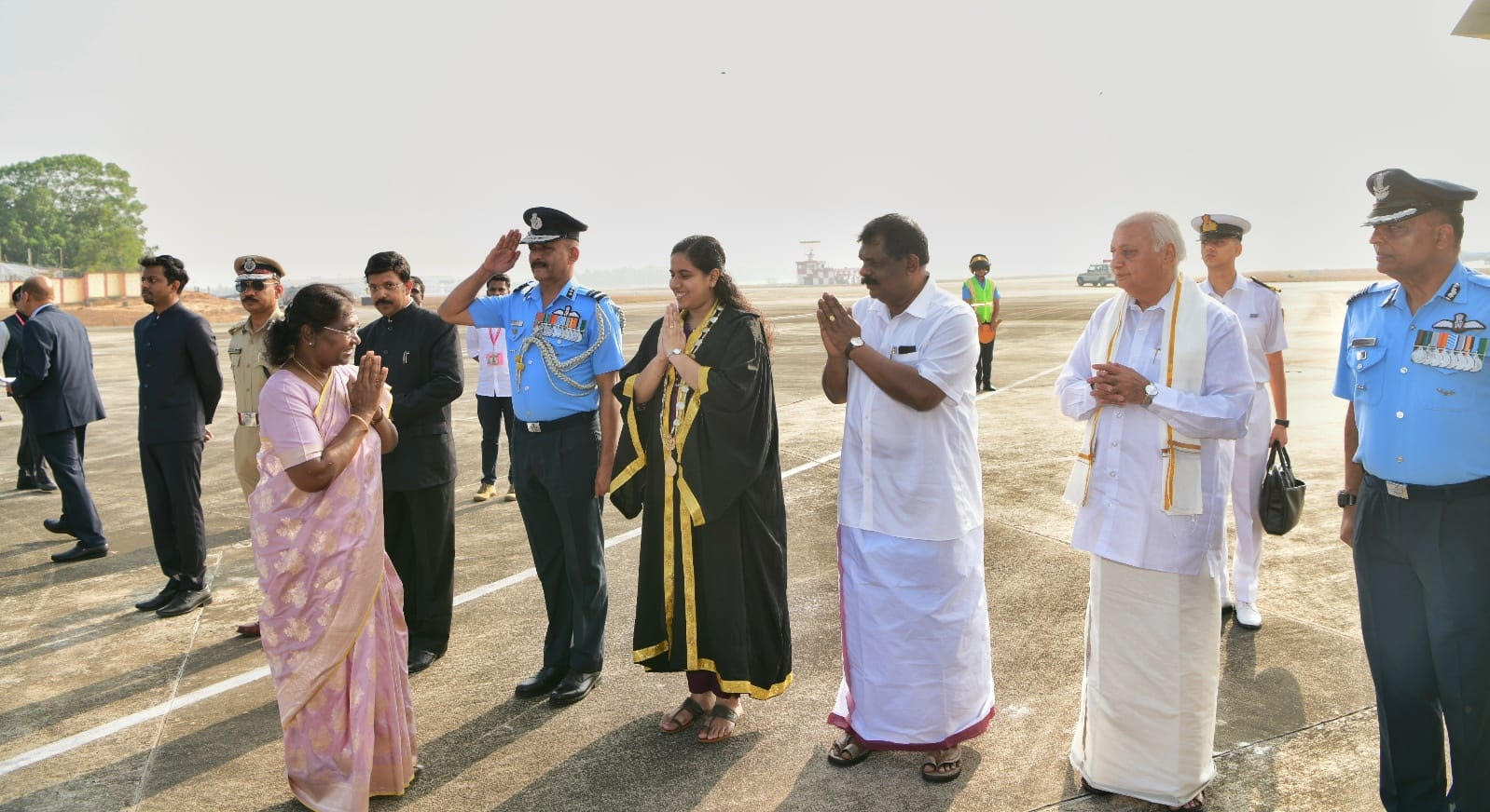 കേരള സന്ദർശനത്തിനെത്തിയ രാഷ്ട്രപതി ദ്രൗപതി മുർമുവിന് തിരുവനന്തപുരം വിമാനത്താവളത്തിൽ ഗാർഡ് ഓഫ് ഓണർ നൽകി. സംയുക്ത സേനാ വിഭാഗങ്ങളുടെ നേതൃത്വത്തിൽ നടന്ന ഗാർഡ് ഓഫ് ഓണർ ചടങ്ങിൽ രാഷ്ട്രപതി അഭിവാദ്യം സ്വീകരിച്ചു. തുടർന്ന് അമൃതാനന്ദമയീ മഠം സന്ദർശിക്കുന്നതിനായി കൊല്ലത്തേക്കു തിരിച്ച രാഷ്ട്രപതിയെ ഗവർണർ ആരിഫ് മുഹമ്മദ് ഖാൻ, ഗതാഗത മന്ത്രി ആന്റണി രാജു, മേയർ ആര്യ രാജേന്ദ്രൻ, എയർ വൈസ് മാർഷൽ എസ്.കെ. വിധാതെ, പൊതുഭരണ വകുപ്പ് അഡിഷണൽ ചീഫ് സെക്രട്ടറി കെ.ആർ. ജ്യോതിലാൽ, തിരുവനന്തപുരം സിറ്റി പൊലീസ് കമ്മിഷണർ നാഗരാജു, ജില്ലാ കളക്ടർ ജെറോമിക് ജോർജ് എന്നിവർ ചേർന്നു യാത്രയാക്കി.