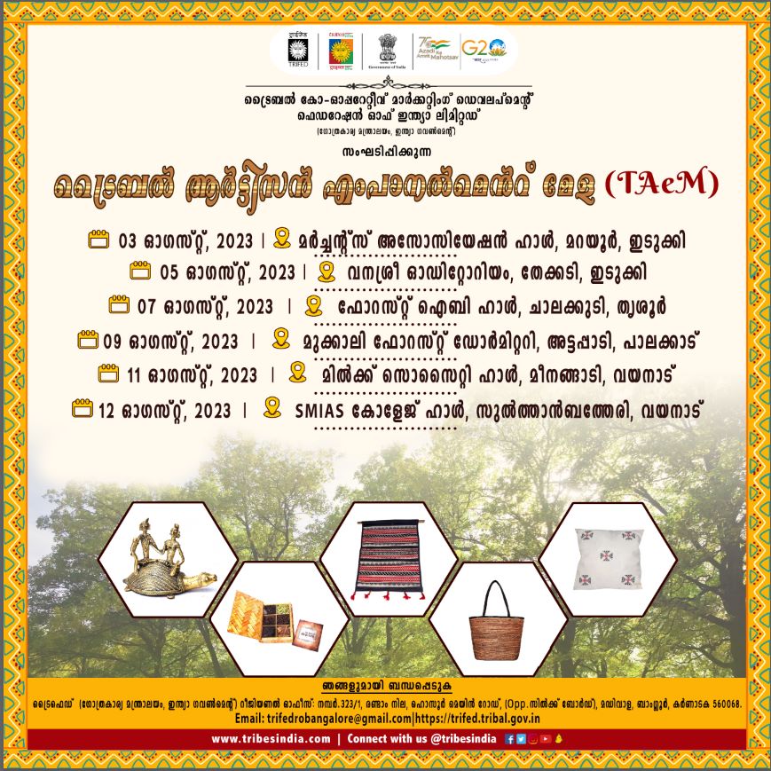 കാട്ടുനായകൻ, ചോളനായ്ക്കൻ, മലയോര പുലയന്മാർ, മലയർ, കാടർ, കുറുമ്പ തുടങ്ങിയ പ്രധാന ഗോത്രങ്ങൾ ഈ പ്രദേശങ്ങളിൽ ഉൾപ്പെടുന്നു. ഗോത്രവർഗക്കാർക്ക് അവരുടെ കലാപരമായ കഴിവുകളും ഉത്പന്നങ്ങളും മേളകളിൽ പ്രദർശിപ്പിക്കാം . ടിഎഇഎമ്മിലെ എംപാനൽമെന്റ് ഉൽപ്പന്നങ്ങൾ മെച്ചപ്പെടുത്തുന്നതിന് ആദിവാസി കരകൗശല തൊഴിലാളികളെ സഹായിക്കുന്നു. കരകൗശലത്തൊഴിലാളികൾക്ക് പുറം വിപണിയുമായി നേരിട്ട് സമ്പർക്കം പുലർത്താനും എംപാനൽമെന്റ് സഹായിക്കുന്നു. ദേശീയ, അന്തർദ്ദേശീയ മാർക്കറ്റിംങ്ങിൽ പരിചയം നേടാൻ ടിഎഇഎം ഇവന്റുകൾ പ്രാദേശിക കരകൗശല വിദഗ്ധരെ സഹായിക്കും. കൂടുതൽ വിവരങ്ങൾക്ക് https://trifed.tribal.gov.in എന്ന വെബ്സൈറ്റ് വഴിയോ , [email protected] ഇമെയിലോ ബന്ധപ്പെടുക.