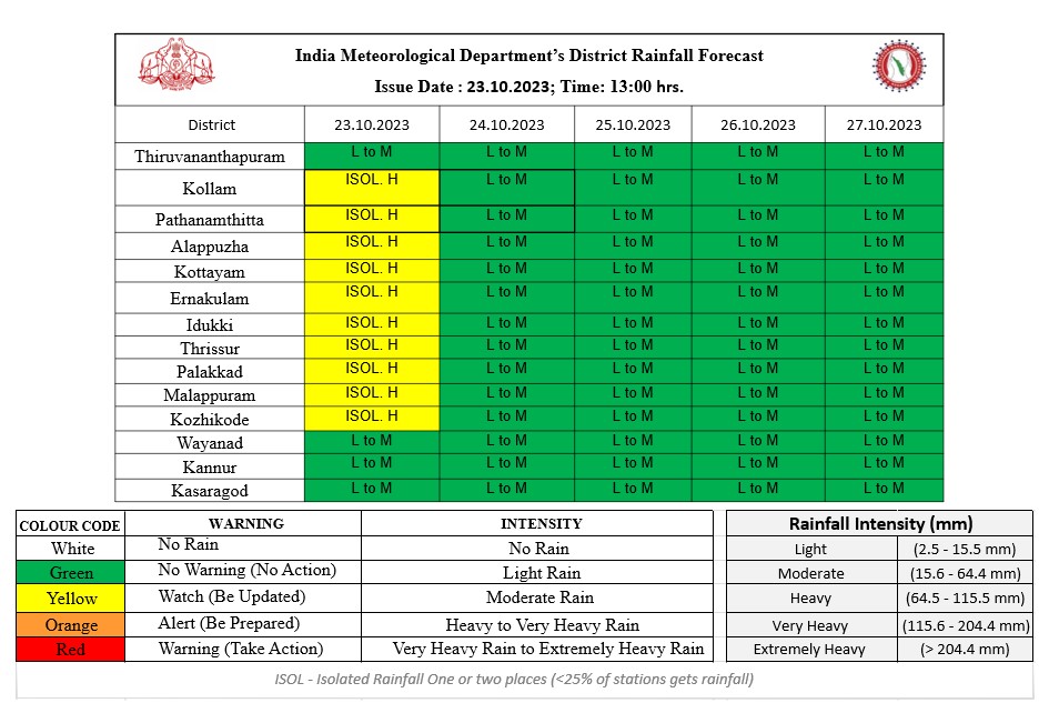 23-10-2023 :കൊല്ലം, പത്തനംതിട്ട, ആലപ്പുഴ, കോട്ടയം, ഇടുക്കി, എറണാകുളം, തൃശ്ശൂർ, പാലക്കാട്, മലപ്പുറം, കോഴിക്കോട് എന്നീ ജില്ലകളിലാണ് മഞ്ഞ അലർട്ട് പ്രഖ്യാപിച്ചിട്ടുള്ളത്. ഒറ്റപ്പെട്ട ശക്തമായ മഴയ്ക്കുള്ള സാധ്യതയാണ് പ്രവചിക്കപ്പെട്ടിരിക്കുന്നത്. 24 മണിക്കൂറിൽ 64.5 മില്ലിമീറ്റർ മുതൽ 115.5 മില്ലിമീറ്റർ വരെ മഴ ലഭിക്കുന്ന സാഹചര്യത്തെയാണ് ശക്തമായ മഴ എന്നത് കൊണ്ട് അർത്ഥമാക്കുന്നത്.