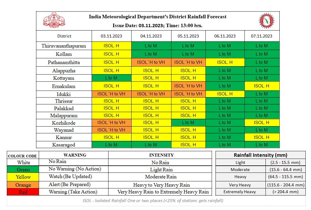 04-11-2023 : ആലപ്പുഴ, കോട്ടയം, എറണാകുളം, തൃശ്ശൂർ,, പാലക്കാട്, മലപ്പുറം, കോഴിക്കോട്, വയനാട്, കണ്ണൂർ
