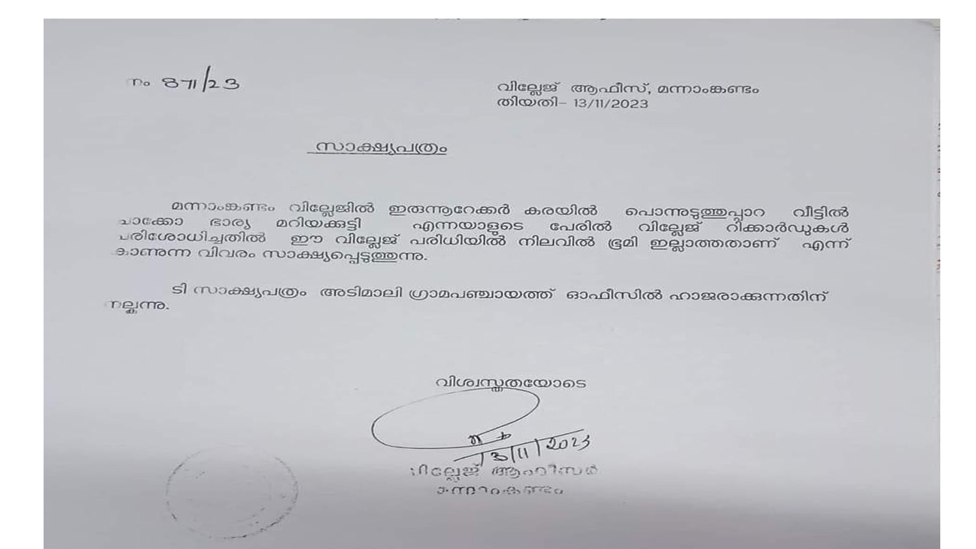മറിയക്കുട്ടിയുടെ പേരിൽ ഭൂമിയില്ല : വില്ലേജ് ഓഫീസർ