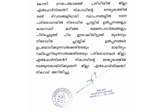 konnivartha.com: പത്തനംതിട്ട ജില്ലാ എന്ഫോഴ്സ്മെന്റ് സ്ക്വാഡിന്റെ നേതൃത്വത്തില് രണ്ടു ദിവസമായി നടന്ന പരിശോധയില് കോന്നിയിലെ കടകളില് നിന്നും നിരോധിത പ്ലാസ്റ്റിക്ക് ഉല്പ്പന്നങ്ങള് , കാലാവധി കഴിഞ്ഞ ഭക്ഷണ പദാര്ഥങ്ങളും പിടിച്ചെടുത്തു പിഴ ഈടാക്കിയതായി കോന്നി പഞ്ചായത്ത് സെക്രട്ടറി അറിയിച്ചു.