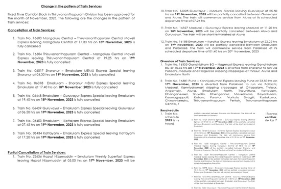 ശനിയാഴ്ച മംഗലാപുരം-തിരുവനന്തപുരം മലബാർ എക്സ്പ്രസ് ഷൊർണൂരിൽ യാത്ര അവസാനിപ്പിക്കും. ഞായറാഴ്ച മംഗലാപുരത്തേക്കുള്ള മലബാർ എക്സ്പ്രസ് ഷൊർണൂരിൽനിന്നാകും യാത്ര ആരംഭിക്കുക.അജ്മീർ-എറണാകുളം മരുസാഗർ എക്സ്പ്രസ് വെള്ളിയാഴ്ച തൃശൂരിൽ യാത്ര അവസാനിപ്പിക്കും.