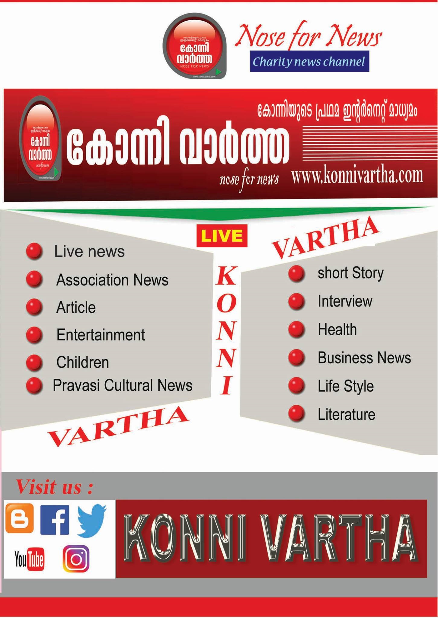 മാധ്യമ രംഗത്തെ വാര്ത്തകള് ,സര്ക്കാര് അറിയിപ്പുകള്,പ്രവാസി മലയാളി അസോസിയേഷന് വാര്ത്തകള് മറ്റിതര വിശേഷങ്ങള് “കോന്നി വാര്ത്താ ഡോട്ട് കോം” ഇന്റര്നെറ്റ് ന്യൂസ് പോര്ട്ടലിലൂടെ വായിക്കുന്ന എല്ലാ സുഹൃത്തുക്കള്ക്കും നന്ദി .പ്രവാസി മലയാളികള്ക്ക് ഇടയിലും പ്രാദേശിക തലത്തിലും കോന്നി വാര്ത്ത ഡോട്ട് കോമിനെ” ഏറെ മുന്നില്” എത്തിച്ച എല്ലാ കൂട്ടുകാര്ക്കും നന്ദി .