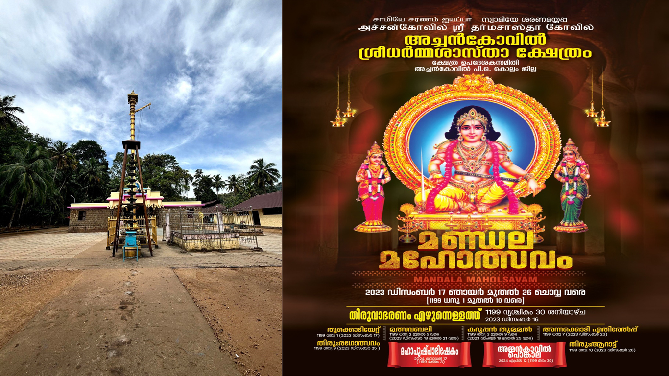 konnivartha.com: അച്ചൻകോവിൽ ശ്രീധർമ്മശാസ്താക്ഷേത്രത്തിലെ മണ്ഡല മഹോത്സവം ഡിസംബര്‍ 17 മുതല്‍ 26 വരെ നടക്കുമെന്ന് ഭാരവാഹികള്‍ അറിയിച്ചു .തിരുവാഭരണ ഘോക്ഷയാത്രയോടെ ആരംഭിച്ച് ധനു ഒന്നാം തീയതി തൃക്കോടിയേറ്റ് ,കറുപ്പന്‍ തുള്ളല്‍ , തിരു രഥോത്സവം തുടങ്ങിയ ആചാര അനുഷ്ടാനങ്ങള്‍ ,കലാപരിപാടികള്‍ നടക്കും .ഡിസംബര്‍ 26 ന് ആറാട്ടോടു കൂടി ഉത്സവം സമാപിക്കും . 2024 ജനുവരി 17 ന് മഹാപുഷ്പാഭിഷേകം നടക്കും . 2024 ഏപ്രില്‍ 12 ന് അമ്മന്‍കാവില്‍ പൊങ്കാല നടക്കും .ഈ മണ്ഡല മഹോത്സവത്തോടനുബന്ധിച്ച് അച്ചൻകോവിൽ ക്ഷേത്ര പതിനെട്ടാം പടിക്ക് താഴെ ഒരു കൊച്ചു പതിനെട്ടാംപടിയുണ്ട് .