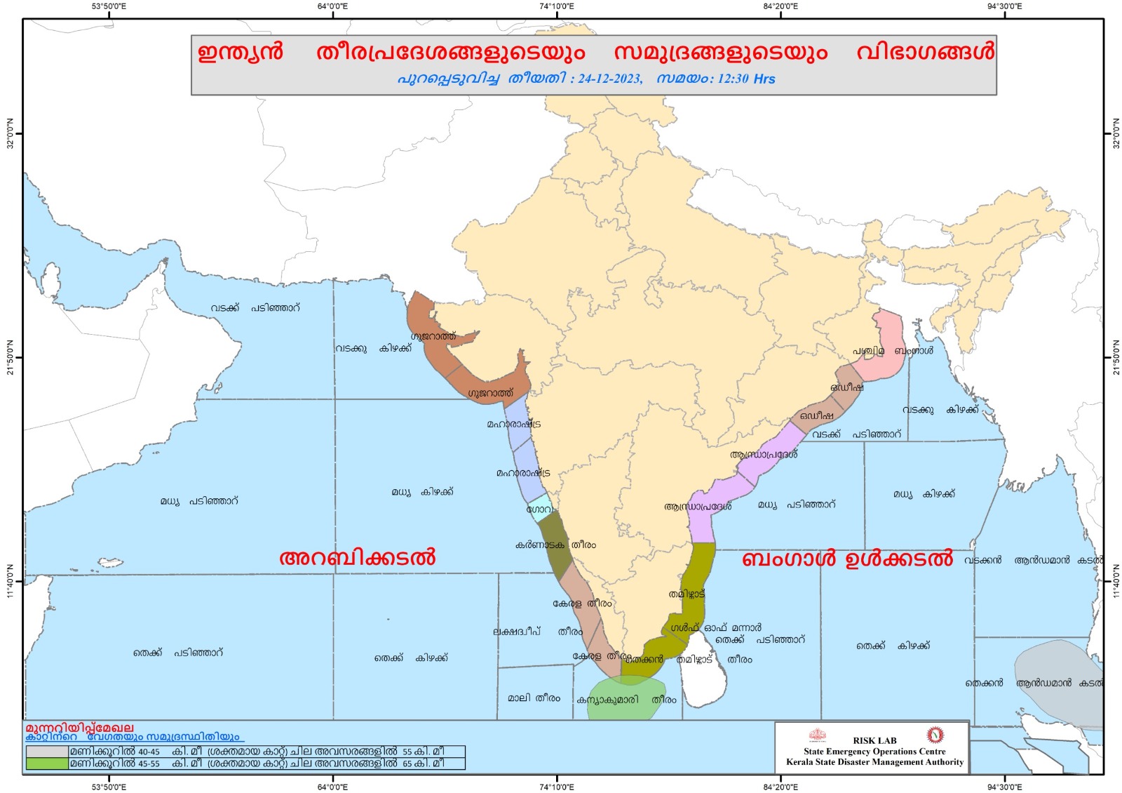 കേരള തീരത്ത് 25-12-2023 (നാളെ) രാത്രി 11.30 വരെ 0.3 മുതൽ 1.2 മീറ്റർ വരെ ഉയർന്ന തിരമാലയ്ക്കും കടലാക്രമണത്തിനും സാധ്യതയുണ്ടെന്ന് ദേശീയ സമുദ്രസ്ഥിതിപഠന ഗവേഷണ കേന്ദ്രം (INCOIS) അറിയിച്ചു.