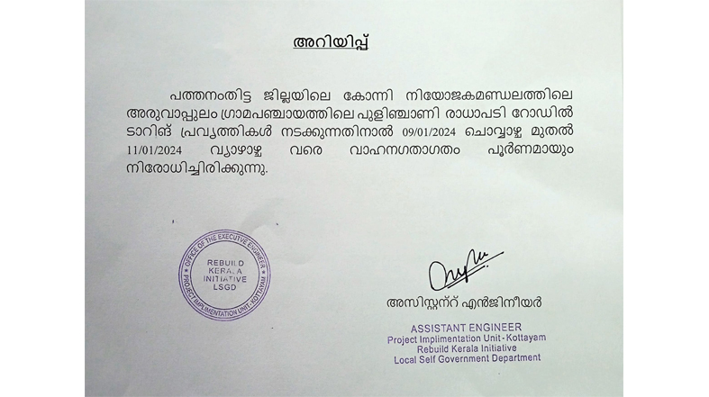 വാഹന ഗതാഗതം പൂര്ണ്ണമായും നിരോധിച്ചു ജനുവരി 8, 2024ജനുവരി 8, 2024 News Editor Spread the lovekonnivartha.com: കോന്നി മണ്ഡലത്തിലെ അരുവാപ്പുലം പഞ്ചായത്തിലെ പുളിഞ്ചാണി -രാധപ്പടി റോഡില് ടാറിങ്ങ് നടക്കുന്നതിനാല് ജനുവരി 09-10-11 തീയതികളില് വാഹനഗതാഗതം പൂര്ണ്ണമായും നിരോധിച്ചു