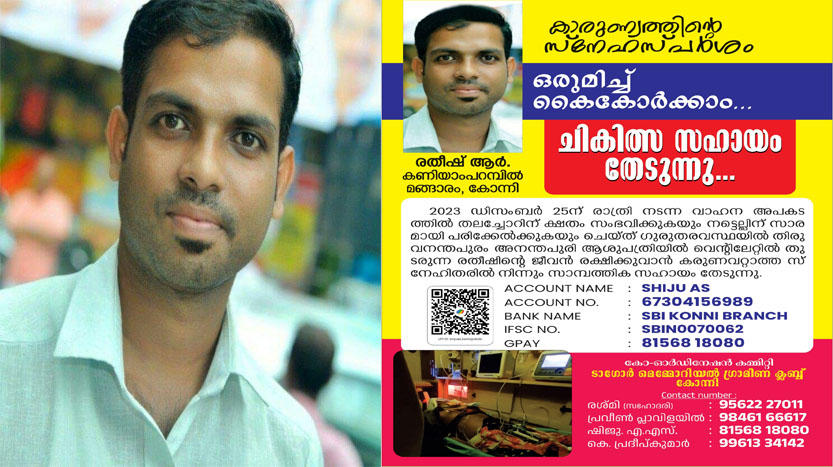 konnivartha.com: 2023 ഡിസംബർ 25 ന് രാത്രിയില് അപ്രതീക്ഷിതമായി സംഭവിച്ച വാഹന അപകടത്തിൽ ഗുരുതരമായി പരിക്കേറ്റ് തിരുവനന്തപുരം അനന്തപുരി ആശുപത്രിയിൽ മെക്കാനിക്കൽ വെന്റിലേറ്ററില് ചികിത്സയില് ഉള്ള പത്തനംതിട്ട കോന്നി ചൈനാമുക്ക് കണിയാംപറമ്പിൽ രതീഷിന്റെ ചികിത്സയുടെ ആവശ്യത്തിലേക്ക് വീട്ടുകാര് ധനസഹായം തേടുന്നു .ഇതിനായി കൂട്ടുകാര് ചേര്ന്ന് ഒരുക്കിയ വാട്സ് ആപ്പ് ഗ്രൂപ്പില് സഹായം അഭ്യര്ഥിച്ചു .