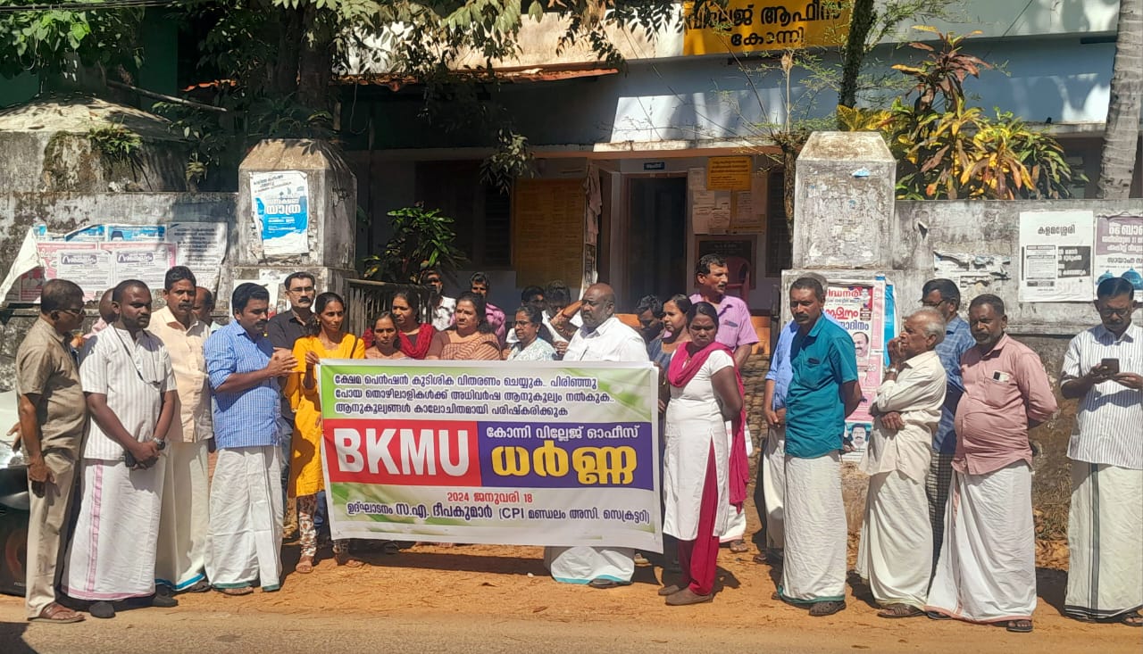 konnivartha.com/ കോന്നി : ക്ഷേമ പെൻഷൻ കുടിശിക വിതരണം ചെയ്യുക,പിരിഞ്ഞു പോയ തൊഴിലാളികൾക്ക് അധിവർഷ ആനുകൂല്യം നൽകുക, ആനുകൂല്യങ്ങൾ കാലോചിതമായി പരിഷ്കരിക്കുക തുടങ്ങിയ ആവശ്യങ്ങൾ ഉന്നയിച്ച് ബി കെ എം യു കോന്നി മണ്ഡലം കമ്മറ്റിയുടെ നേതൃത്വത്തിൽ കോന്നി വില്ലേജ് ഓഫീസിന് മുന്നിൽ സംഘടിപ്പിച്ച ധർണ്ണ സി പി ഐ കോന്നി മണ്ഡലം അസിസ്റ്റന്റ് സെക്രട്ടറി എ ദീപകുമാർ ഉത്ഘാടനം ചെയ്തു.