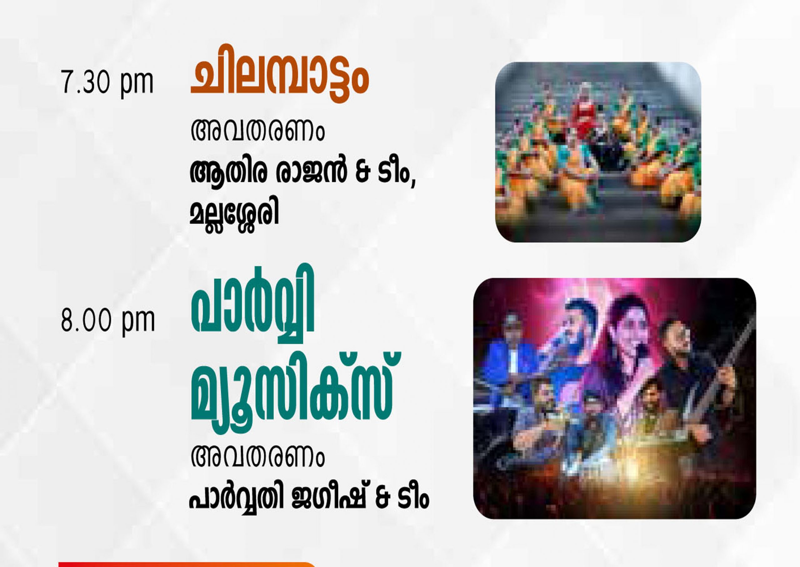 കോന്നി ഫെസ്റ്റ് : ഇന്നത്തെ പരിപാടികള് ( 2024 ജനുവരി 24 ബുധൻ) ജനുവരി 24, 2024 News Editor Spread the love 2024 ജനുവരി 24 ബുധൻ 6 മുതൽ പൂങ്കാവ് അരുണോദയം കലാക്ഷേത്ര ഡാൻസ് അക്കാദമി അവതരിപ്പിക്കുന്ന നടന വിസ്മയം 7.30 മുതൽ മല്ലശ്ശേരി അതിര രാജൻ & ടീം അവതരിപ്പിക്കുന്ന ചിലമ്പാട്ടം 8 മണി മുതൽ പാർവ്വതി ജഗീഷ് ടീം അവതരിപ്പിക്കുന്ന പാർവ്വി മ്യൂസിക്സ്