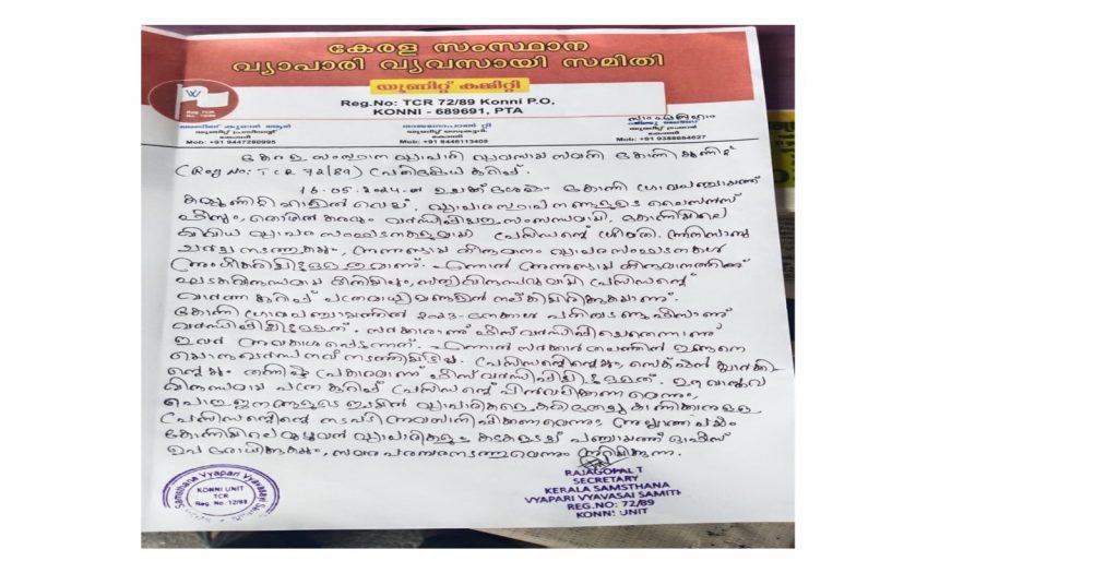 konnivartha.com: കോന്നിയിലെ വ്യാപാരികളുടെ ലൈസന്സ് ഫീസ് , തൊഴില്ക്കരം എന്നിവ സംബന്ധിച്ച് വ്യാപാരികളും കോന്നി പഞ്ചായത്ത് അധികാരികളും തമ്മില് നടത്തിയ ചര്ച്ചയില് ഉണ്ടായ തീരുമാനം നടപ്പായില്ല . തീരുമാനം എടുത്തു എങ്കിലും ഘടക വിരുദ്ധമായ പ്രസ്താവന ആണ് പഞ്ചായത്ത് ഭാഗത്ത് നിന്നും ഉണ്ടായത് എന്ന് വ്യാപാരി സമിതി ആരോപിക്കുന്നു .