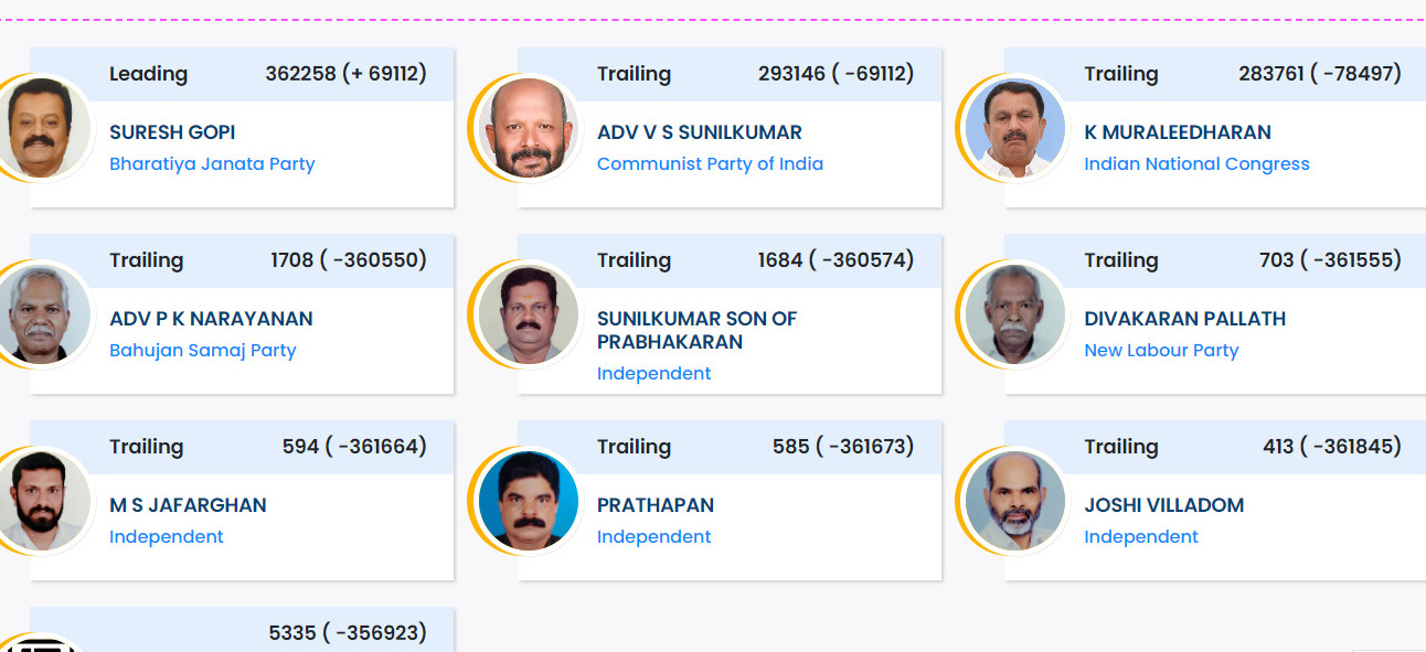 തൃശൂരില്‍ സുരേഷ് ഗോപിയ്ക്ക് 69112 വോട്ട് ഭൂരിപക്ഷം : എന്‍ ഡി എ മുന്നേറുന്നു