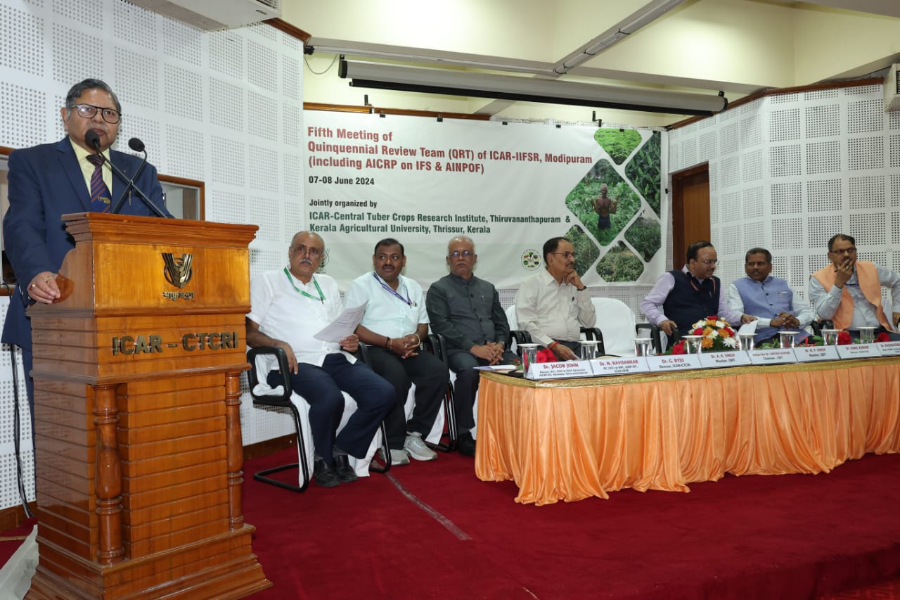 Quinquennial Review of Research on Integrated Farming Systems, Organic and Natural farming undertaken through AICRP-IFS and AINP-OF of ICAR-IIFSR was held at ICAR-CTCRI, Thiruvananthapuram on 7th 8th June 2024. Dr Arvind Kumar, Former VC, RLBCAU, Dr A.K. Singh, Former VC, BAU and Dr NP Singh, Member, CACP reviewed the activities. Dr G. Byju, Director, ICAR-CTCRI inaugurated the meeting and explained achievements of CTCRI. He also elaborated the role and potential of tuber crops in farming systems.