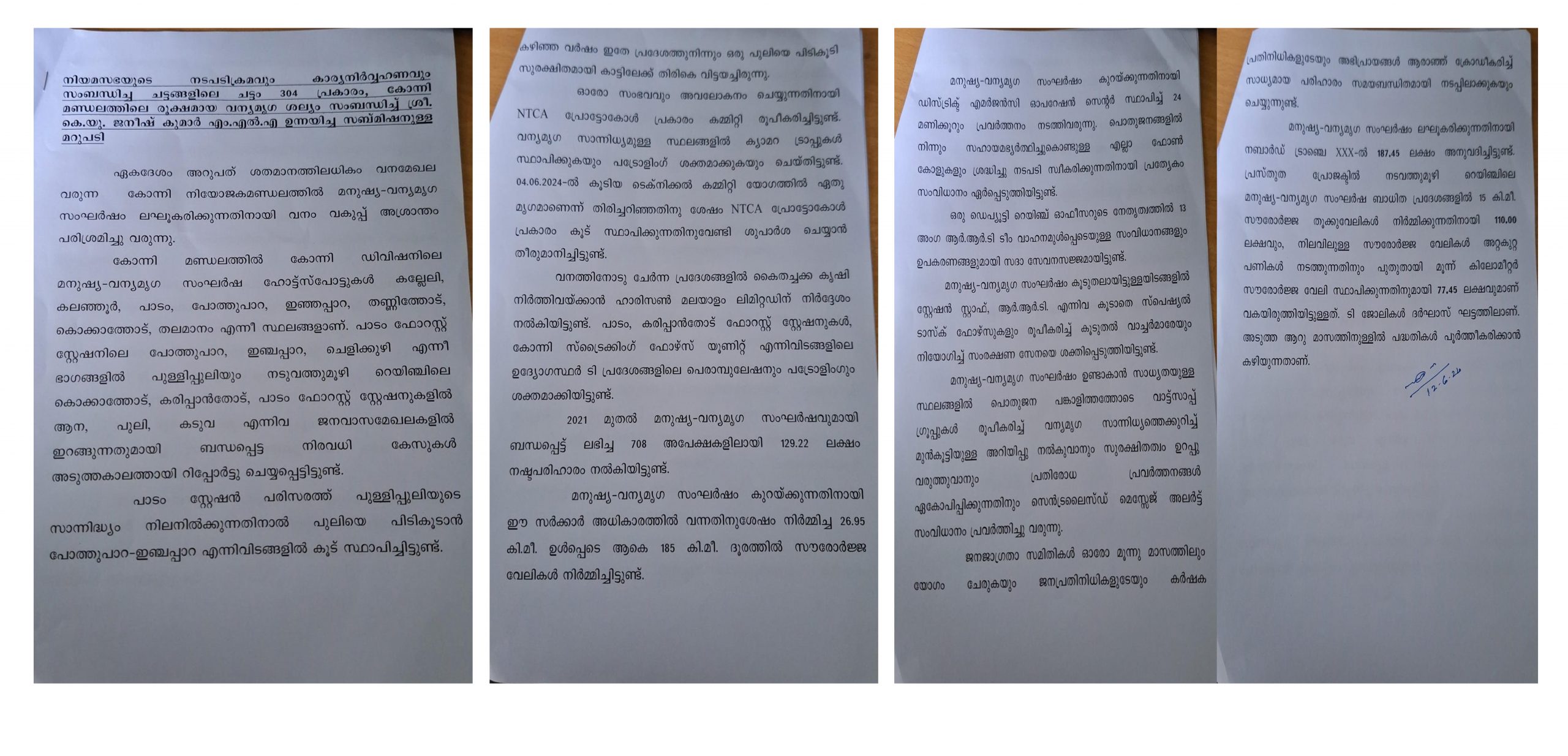 മനുഷ്യ മൃഗ ശല്യം ലഘൂകരിക്കാന് വനം വകുപ്പ് അശ്രാന്തം പരിശ്രമിച്ചു വരുന്നതായും എം എല് എ യുടെ ചോദ്യങ്ങള്ക്ക് ഉള്ള മറുപടിയില് പറയുന്നു .