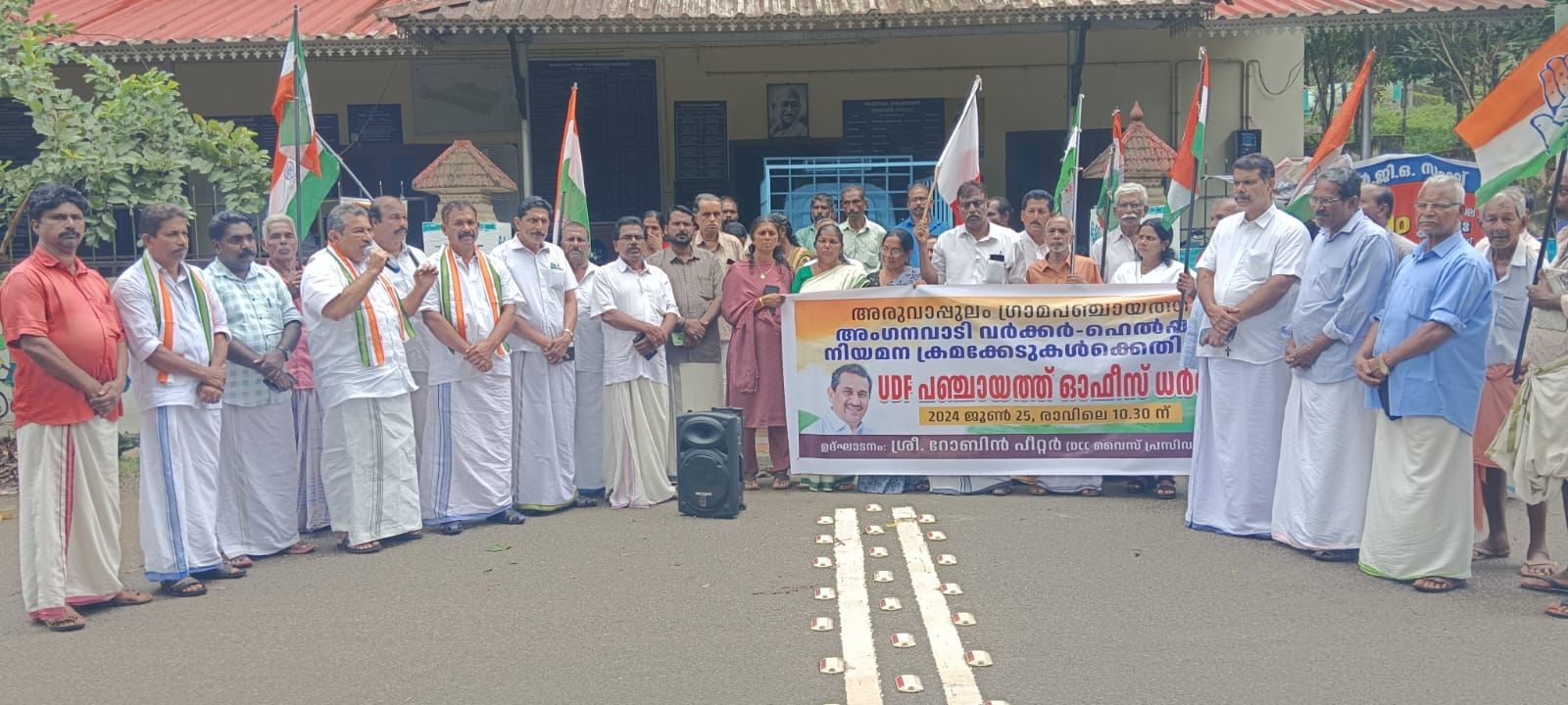 യു ഡി എഫ് അരുവാപ്പുലം മണ്ഡലം കമ്മറ്റി പഞ്ചായത്ത് ഓഫീസിലേക്ക് നടത്തിയ ധർണ ഉദ്ഘാടനം ചെയ്തു സംസാരിക്കുകയായിരുന്നു റോബിന്‍ പീറ്റര്‍ . യു ഡി എഫ് മണ്ഡലം ചെയർമാൻ കെ പി തോസ് അദ്ധ്യഷനായിരുന്നു. ബ്ലോക്ക് അധ്യക്ഷന്‍ ആര്‍ദേവകുമാർ ,ജി എസ് സന്തോഷ് കുമാർ, ജി ശ്രീകുമാർ, ജോയി തോമസ്,പ്രവീൺ പ്ലാവിള, തോമസ് കുട്ടി, ശാന്തിജൻ,സുജാത മോഹൻ, ഇടുക്കിള ഫിലിപ്പിപ്പോസ് ,അമ്പിളി സുരേഷ്,റ്റി ഡി സന്തോഷ്, സ്മിത സന്തോഷ്, മിനി ഇടുക്കിള, ബാബു എസ് നായർ, കെ ആര്‍ ഷാജി ,ബിജു കുമണ്ണൂർ. എന്‍ കെ ജോസ്. സുമതി രമണൻ. രാജഗോപലൻ നായർ. സജി. വിച്ചുകുട്ടൻ നായർ. റ്റി ഡി ശേഖർ. അനിൽ കോടൻവിള . സുരേഷ് . സലാം വറുവേലിൽ. ലൗലി കൊക്കാത്തോട്. ബിനു കൊച്ചക്കര.എന്നിവർ സംസാരിച്ചു