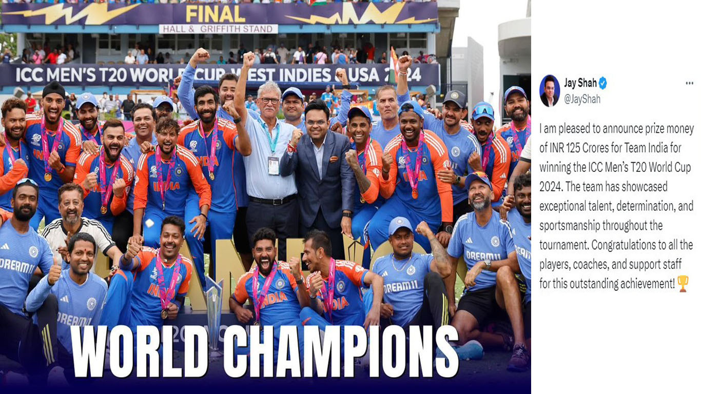 ബിസിസിഐ സെക്രട്ടറി ജയ് ഷായാണ് പ്രഖ്യാപനം നടത്തിയത്.താരങ്ങള്ക്കും പരിശീലകര്ക്കും സപ്പോട്ടിങ് സ്റ്റാഫിനും അഭിനന്ദനങ്ങളും അദ്ദേഹം അറിയിച്ചു.ശനിയാഴ്ച നടന്ന ഫൈനലില് ദക്ഷിണാഫ്രിക്കയെ ഏഴ് റണ്സിന് പരാജയപ്പെടുത്തിയാണ് ഇന്ത്യ ടി20 ലോകകപ്പില് മുത്തമിട്ടത് .ഇന്ത്യയുടെ രണ്ടാം ടി20 ലോകകപ്പ് വിജയമാണിത്. 2007-ലാണ് ഇന്ത്യ ഇതിന് മുമ്പ് ടി20 ലോകകപ്പില് മുത്തമിട്ടത്.