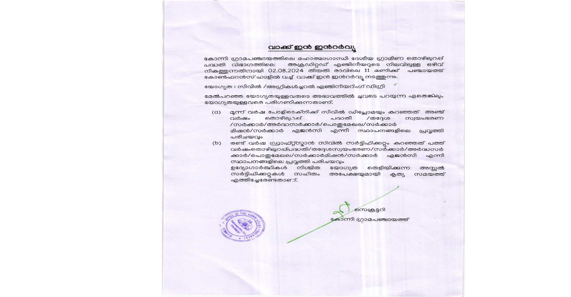 konnivartha.com: കോന്നി പഞ്ചായത്തിലെ മഹാത്മാഗാന്ധി ദേശീയ തൊഴില് ഉറപ്പ് പദ്ധതിയിലെ അക്രഡിറ്റഡ് എഞ്ചിനീയറുടെ നിലവില് ഉള്ള ഒഴിവു നികത്തുന്നതിനായി 02/08 /2024 തീയതി രാവിലെ 11 മണിയ്ക്ക് പഞ്ചായത്തില് വെച്ചു വാക്ക് ഇന് ഇന്റര്വ്യൂ നടത്തും എന്ന് പഞ്ചായത്ത് സെക്രട്ടറി അറിയിച്ചു